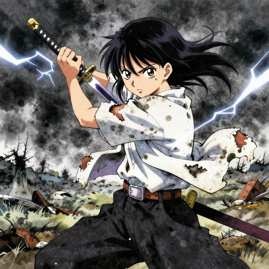 Jirai kei anime girl amidst a stormy battlefield, torn clothes and dirt smudges, fierce and focused expression, wielding a katana with lightning crackling in the background, dynamic action composition, bold ink lines with vibrant color highlights.
