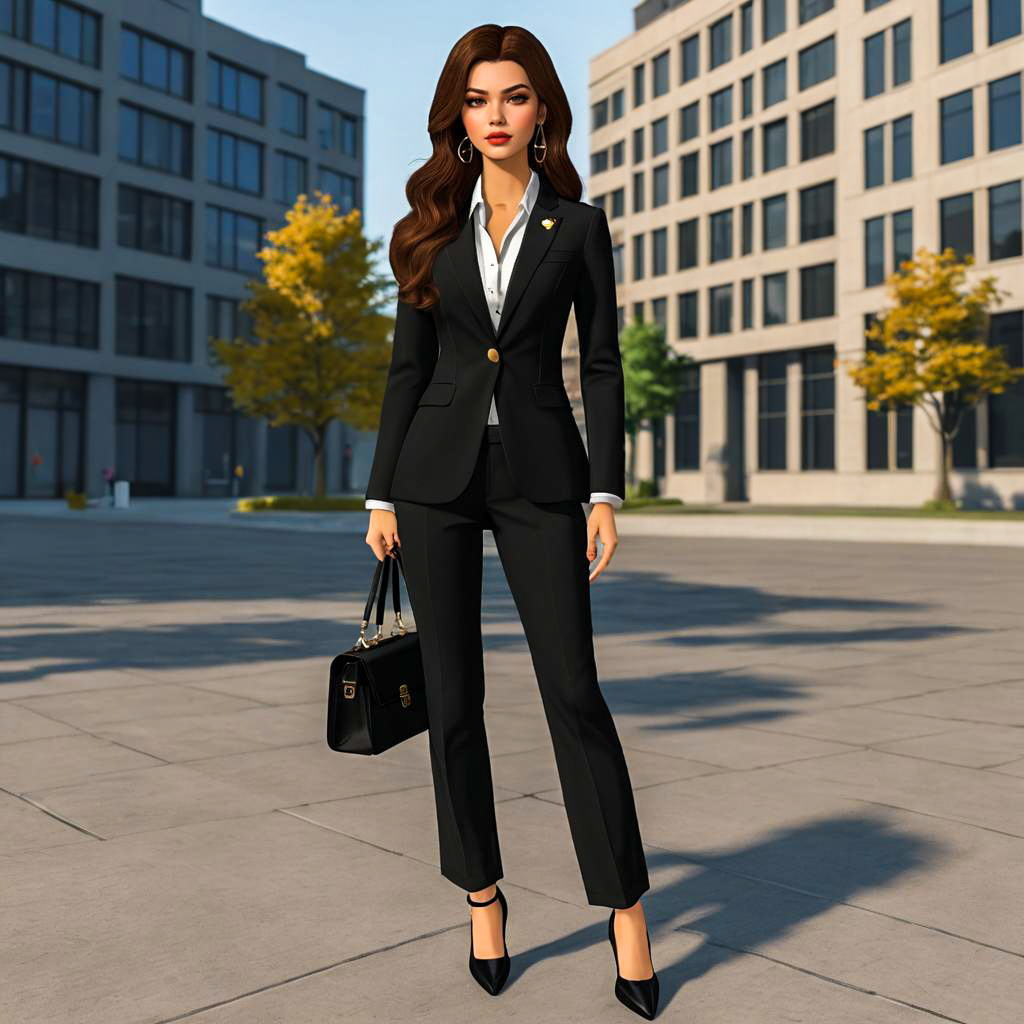 Young adult female, Average Build, Long Wavy Hair, imvu outfit viewer, business casual blazer and trousers with pointy toe flats, briefcase, professional simplicity