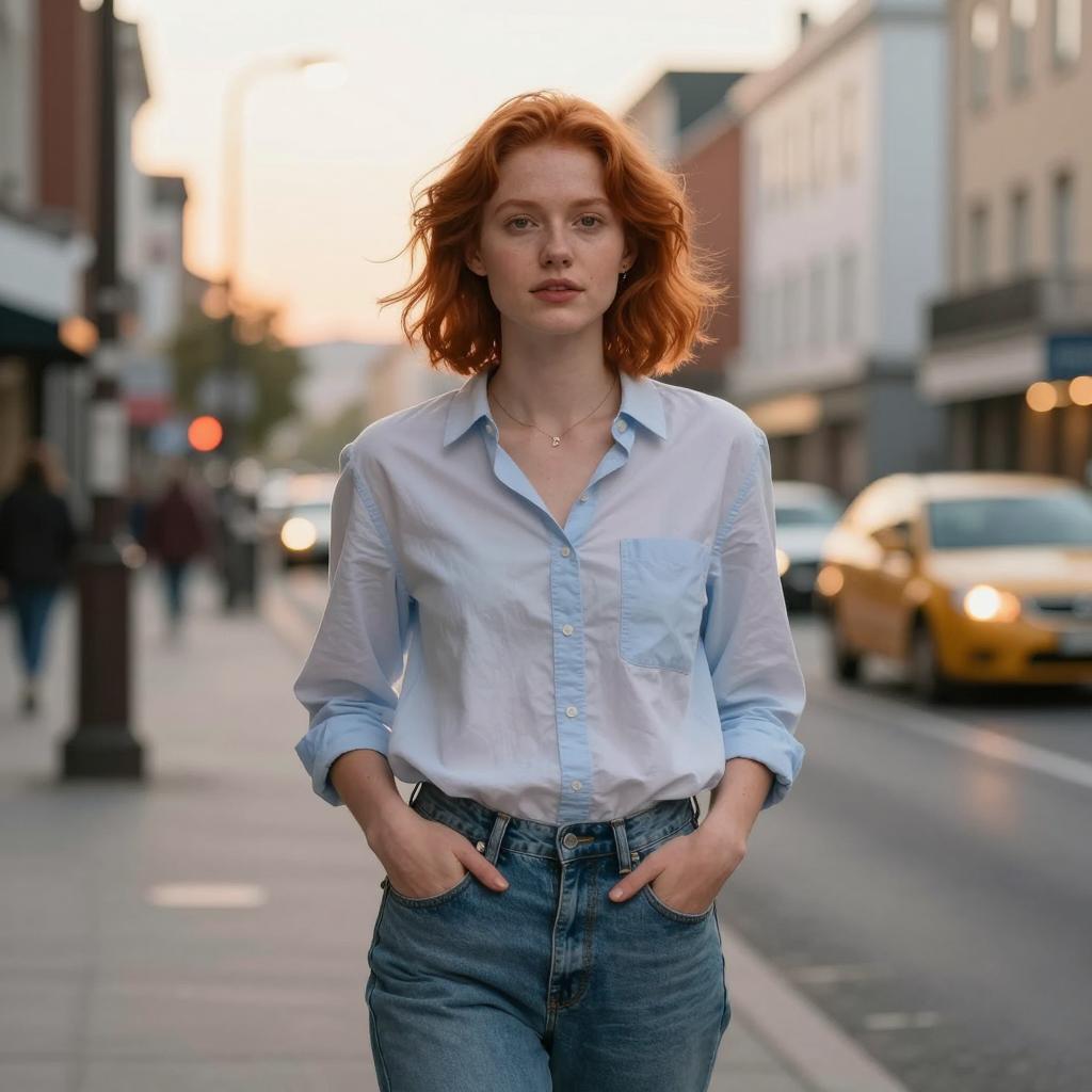 A young woman with short wavy red hair stands confidently in an urban street during golden hour. She is wearing a light blue and white casual button-up shirt and blue jeans, hands in pockets. The background shows blurred city buildings and glowing bokeh lights from street lamps and cars, creating a warm and inviting atmosphere with soft natural lighting. The image captures realistic skin tones and textures with a cinematic portrait style.