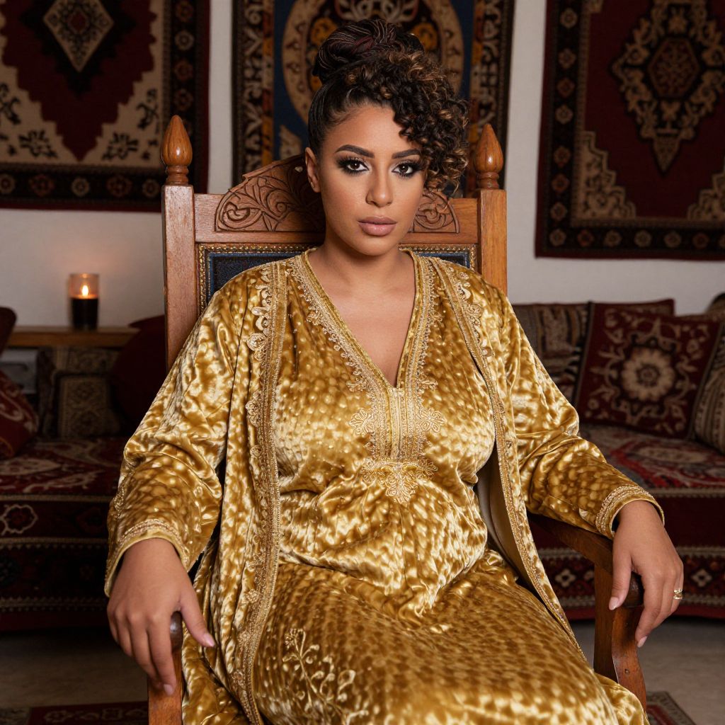 A proud Algerian traditional woman with a strong jawline, deep brown eyes, and naturally curly hair tied in a traditional knot rests on a carved wooden chair in a family home near Constantine, wearing a luxurious velvet gold dress with fine gold embroidery along the neckline and sleeves. The room is decorated with vintage rugs and candlelight, evoking a rich cultural atmosphere.. The woman has big tits and cute face