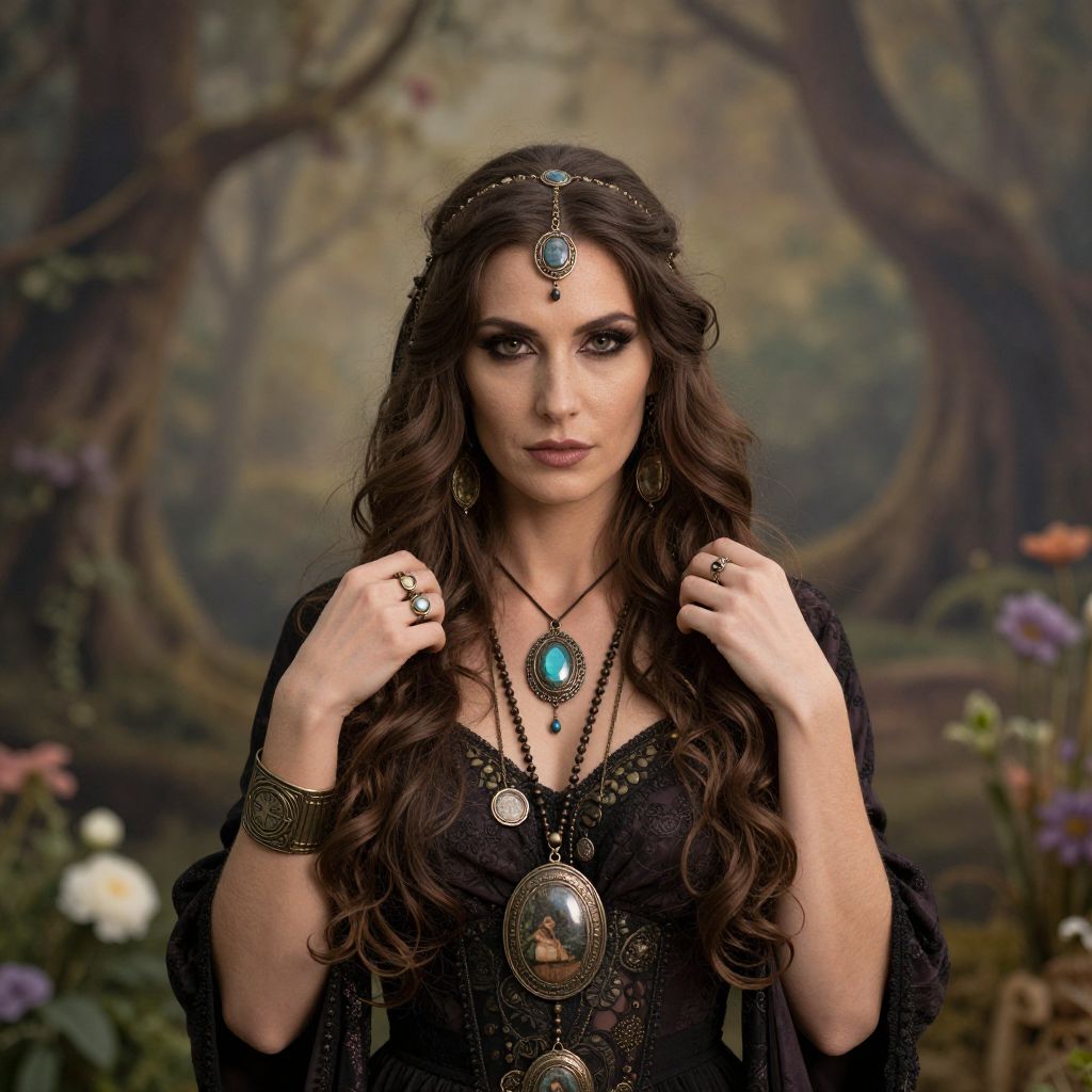 Photograph-style digital artwork of a dark-haired, fair-skinned woman with intense eyes, wearing elaborate jewelry and black lace, against a mystical forest background