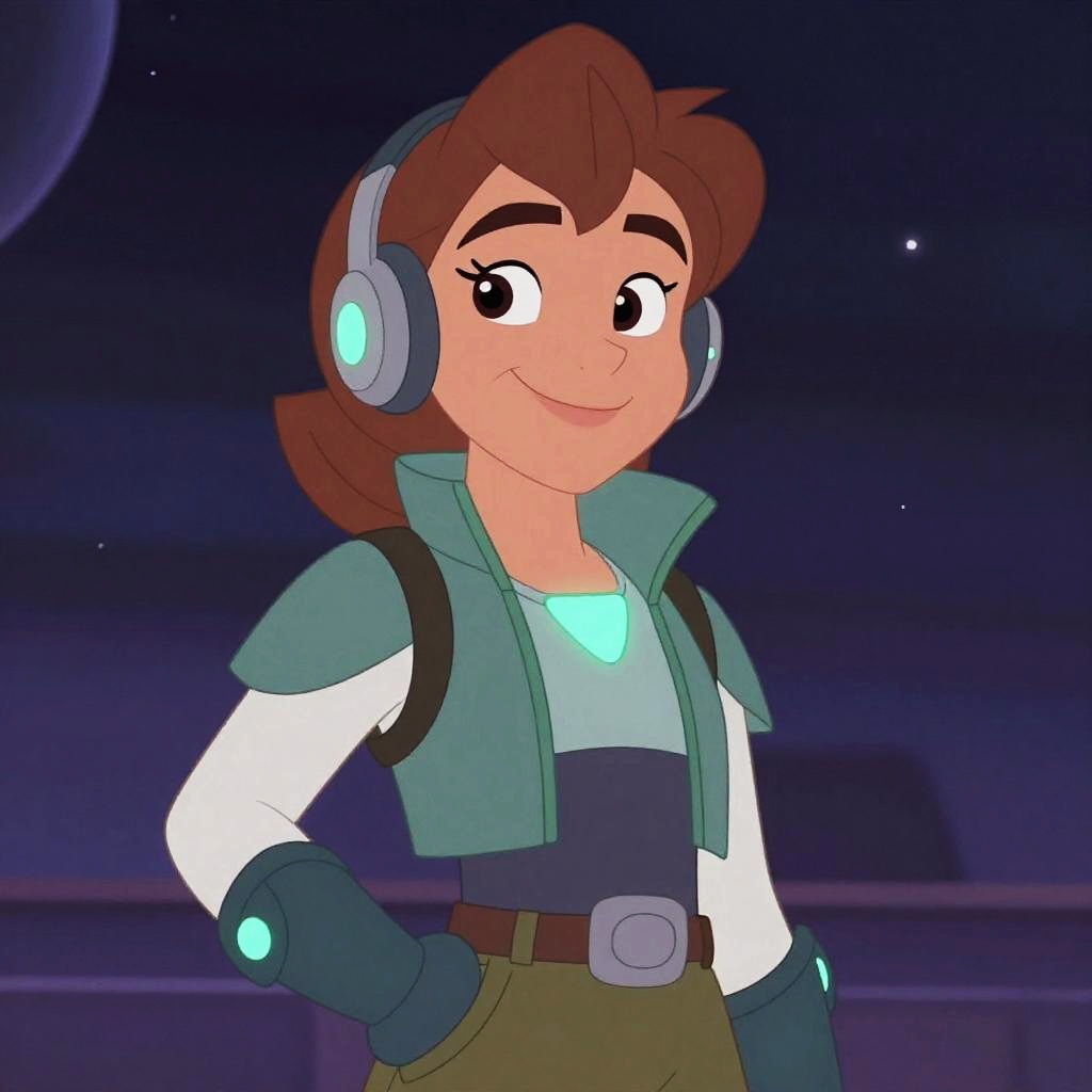 Bucky O'Hare Jenny animated style character portrait, confident smile, cool futuristic outfit, glowing tech accessories, softly lit background with space theme