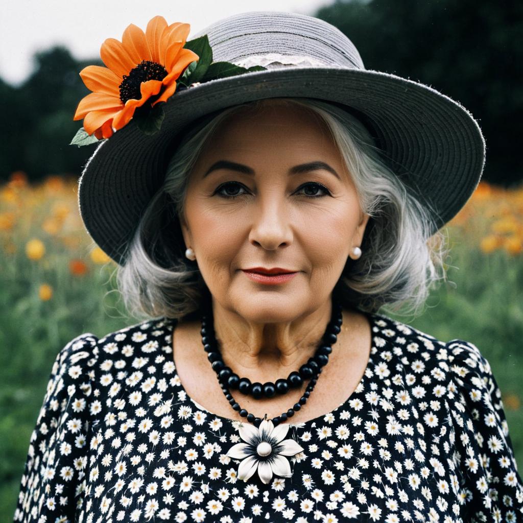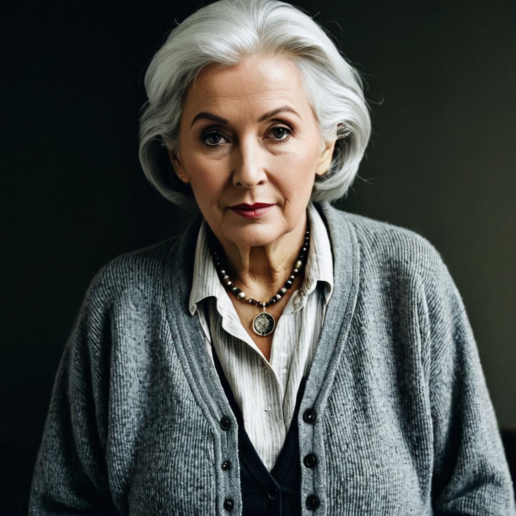 Mrs doubtfire costume,1girl, old woman, solo, glasses, old, grey hair, jacket, round eyewear, closed mouth, realistic, looking at viewer, dress, jewelry, long sleeves, blurry, blurry background, lips, earrings, wrinkled skin
