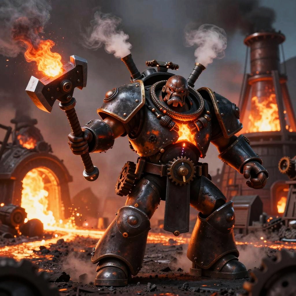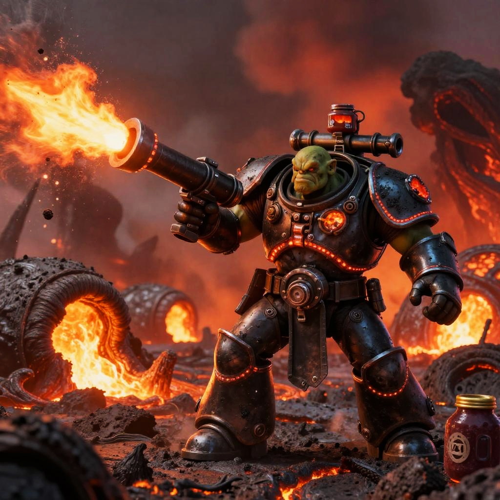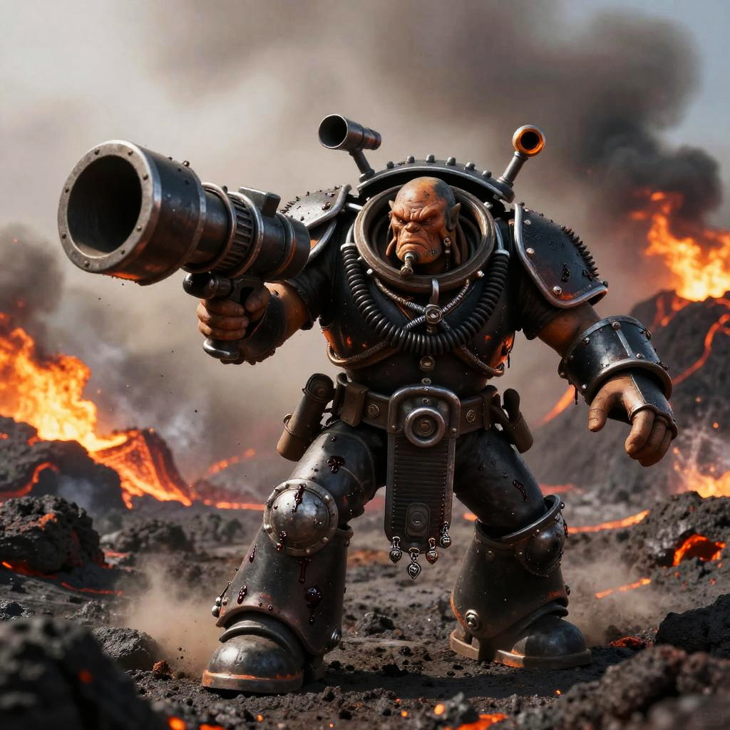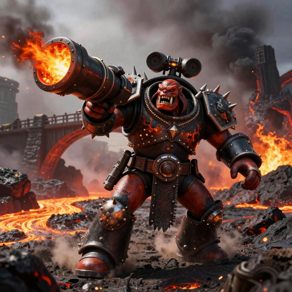 Ork Warlord Charging Through Molten Foundry