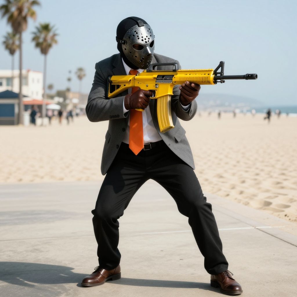 Front 3/4 view portrait of a Armored bank robber using (or firing with) a bright metallic yellow assault rifle.The robber is masked with a very intricate dark black steel and carbon fiber hockey mask (with small eye holes).The robber wears a smart attire. Grey smart jacket, black smart pants, brown smart shoes, brown leather driving fingers-less gloves, bright orange tie on a white office shirt.Dynamic, action, shooting pose.Cinematic.Background of a sunny day at Venice Beach, Los Angeles, California. Many details everywhere. Ray-Tracing. Anti-Aliasing. Realistic reflections. Realistic soft shadows. Slightly desaturated colors. Insane quality. Insane resolution. Insane details. Masterpiece. 16k resolution. Dynamic shot by Simon Stalenhag.