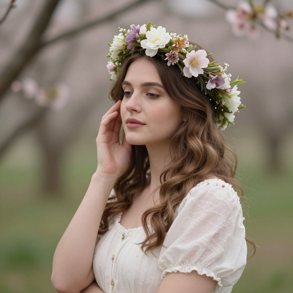 Embracing the essence of renewal, a woman adorned with a floral crown stands as a living embodiment of spring's promise, her presence radiating serenity and the timeless allure of nature's rebirth.