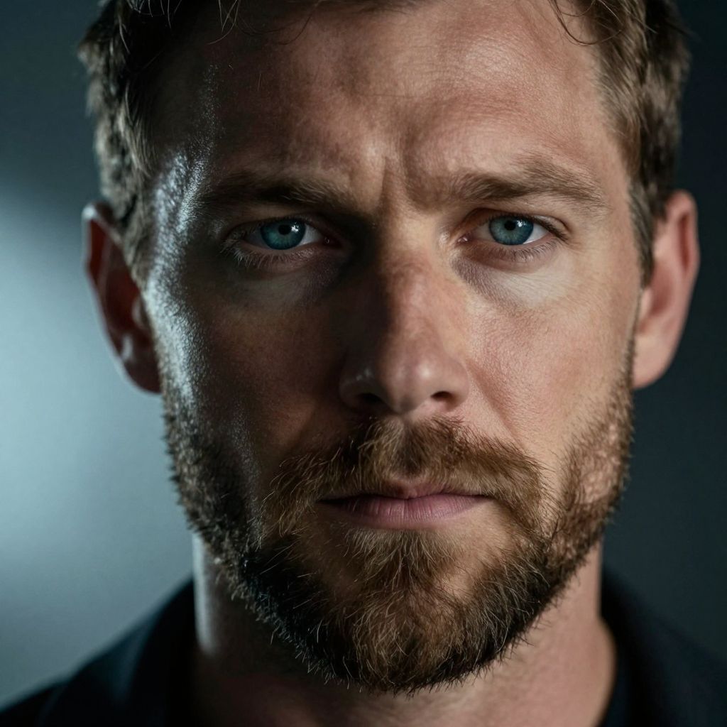 Close-up photograph of a bearded man with blue eyes, short brown hair, and slightly furrowed brows, illuminated by soft, blue light.