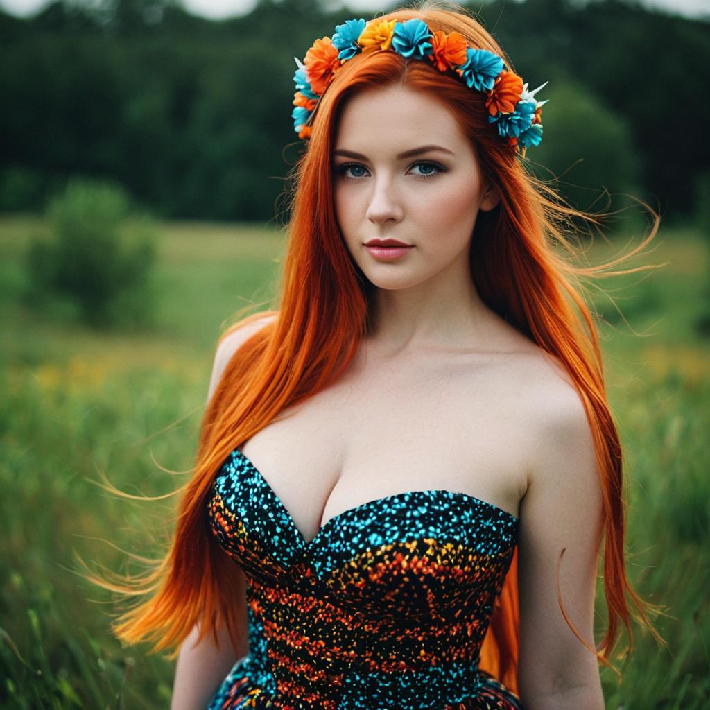 Red-haired Woman in Floral Dress with Flower Crown