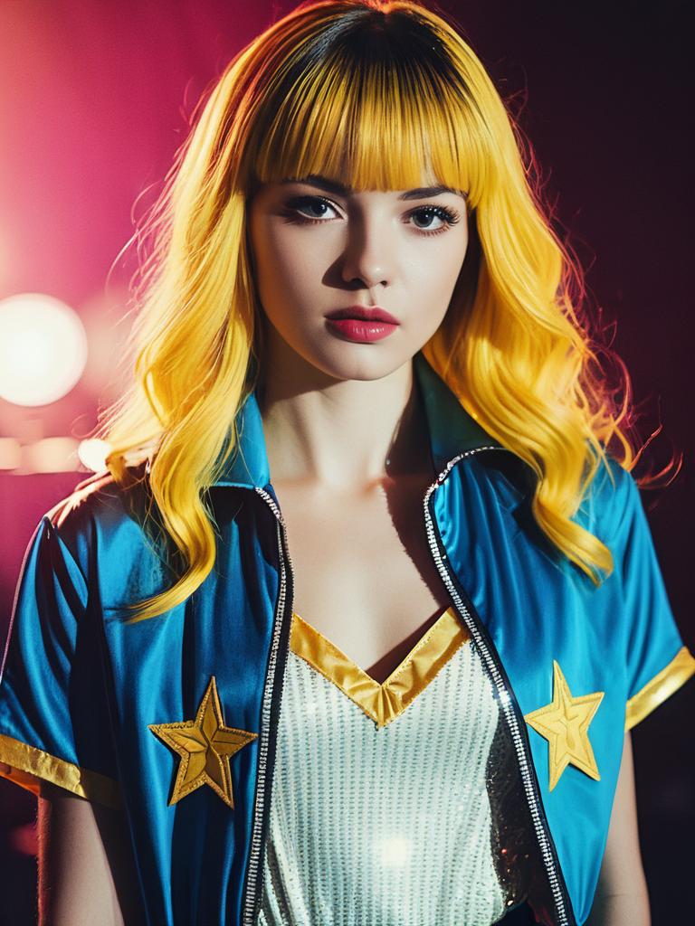 Portrait of a young woman with vibrant yellow hair styled in waves and blunt bangs, wearing a shiny blue jacket with yellow star patches over a metallic silver and gold top, set against a cinematic, colorful studio background with dramatic lighting.