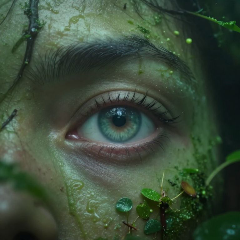 An ethereal eye, cloaked in verdant life, gazes eternally through the misty jungle, embodying the silent vigilance of nature and the enigmatic depths of consciousness.