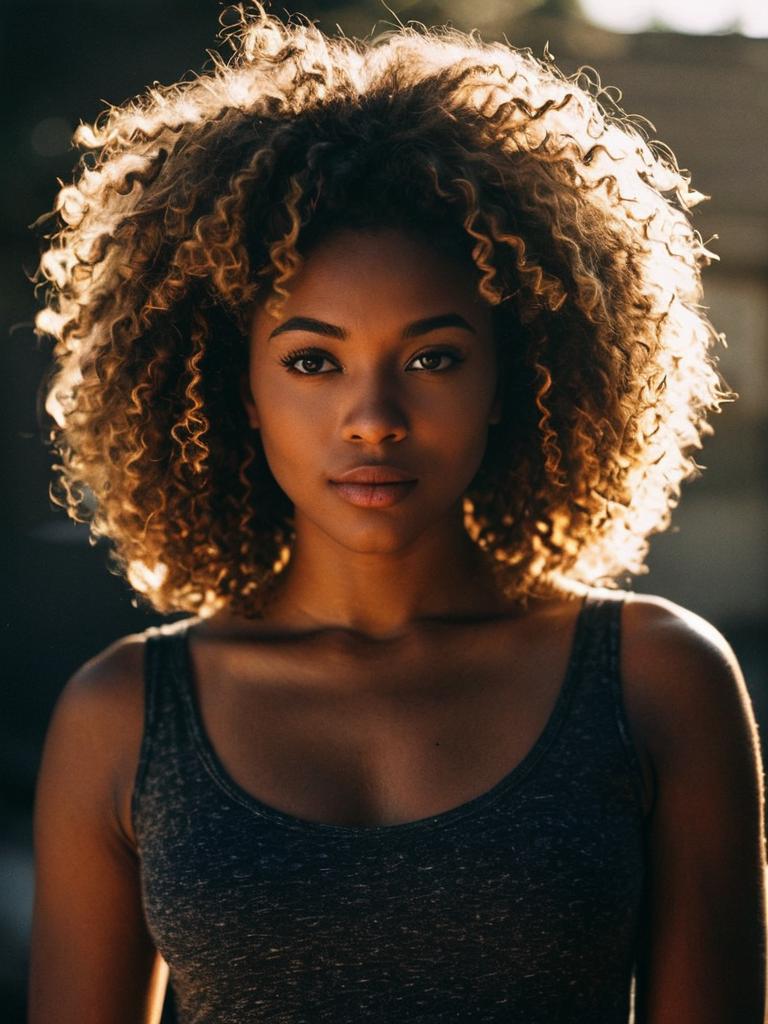 Close-up portrait of a dark-skinned woman with medium-length, curly blonde hair illuminated by backlighting. She wears a dark, sleeveless, dotted bodysuit and looks directly at the camera with a closed mouth and calm expression. The sunlight highlights her hair, creating a glowing halo effect against the blurry background.