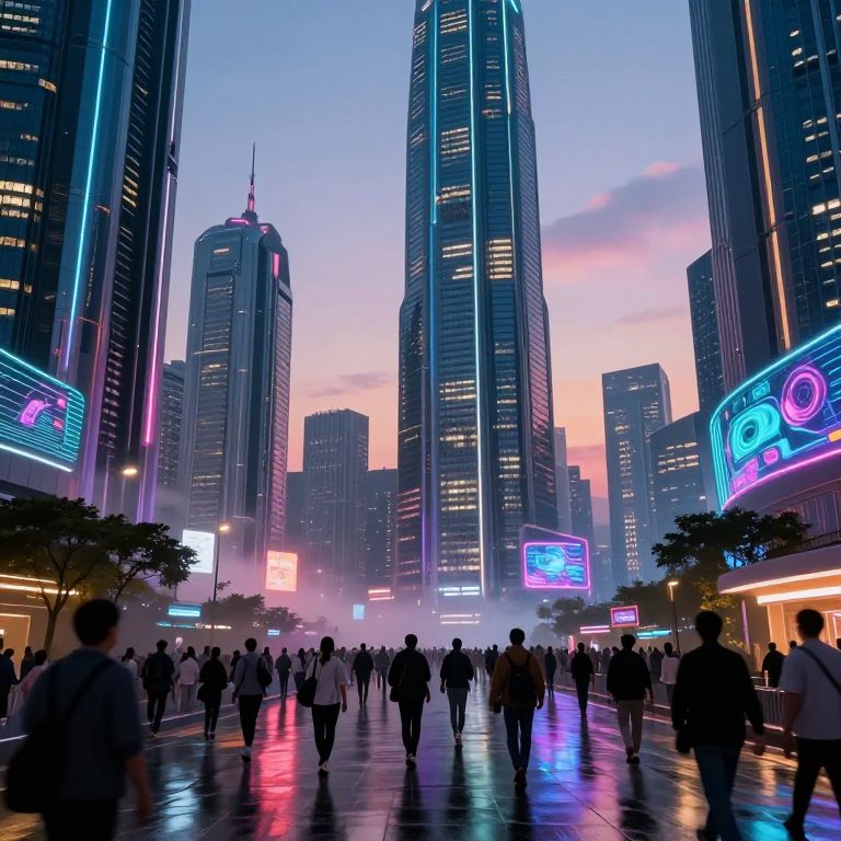 Kubli, futuristic cityscape at dusk with neon lights reflecting on wet streets, sleek towering skyscrapers, cyberpunk style, bustling crowd with diverse characters, vibrant color palette, intricate architectural details, atmospheric mist and glowing holograms