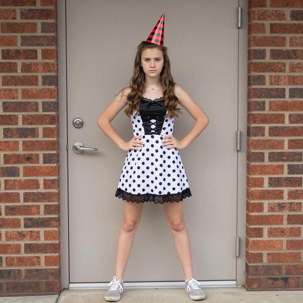 Dance moms halloween costume, photorealistic, teenage girl, standing in front of closed door, wearing black and white polka dot dress with black lace-up front, black lace trim, red and black striped party hat, gray sneakers, long brown wavy hair, casual pose, hands on hips, brick walls on both sides, gray door, daytime, natural light, realistic ures, full body shot, slightly serious expression, neutral background, photography style, casual outfit, festive hat