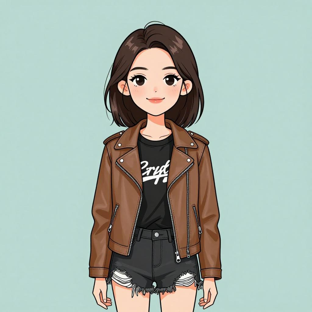 This digital drawing depicts a young woman with fair skin and long brown hair, smiling with a slight blush on her cheeks. She wears a black leather jacket over a light grey hooded sweatshirt, paired with high-waisted, blue denim shorts that have white frayed edges. Around her neck, she has a turquoise pendant on a silver chain. The background is a simple, solid light blue, keeping the focus on her. The art style is vibrant and cartoonish, with clean lines and bright colors, emphasizing a casual, modern look.
