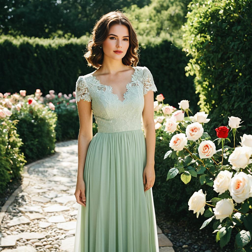 Chiffon dress, photograph of a woman, standing on a dirt path, wearing a sleeveless, light blue, V-neck, flowy dress with a high slit, curly brown hair, natural makeup, sunny outdoor garden, tall green grass, wildflowers, pink and white flowers on the right, soft sunlight, blurred background, calm expression, summer, elegant, serene atmosphere