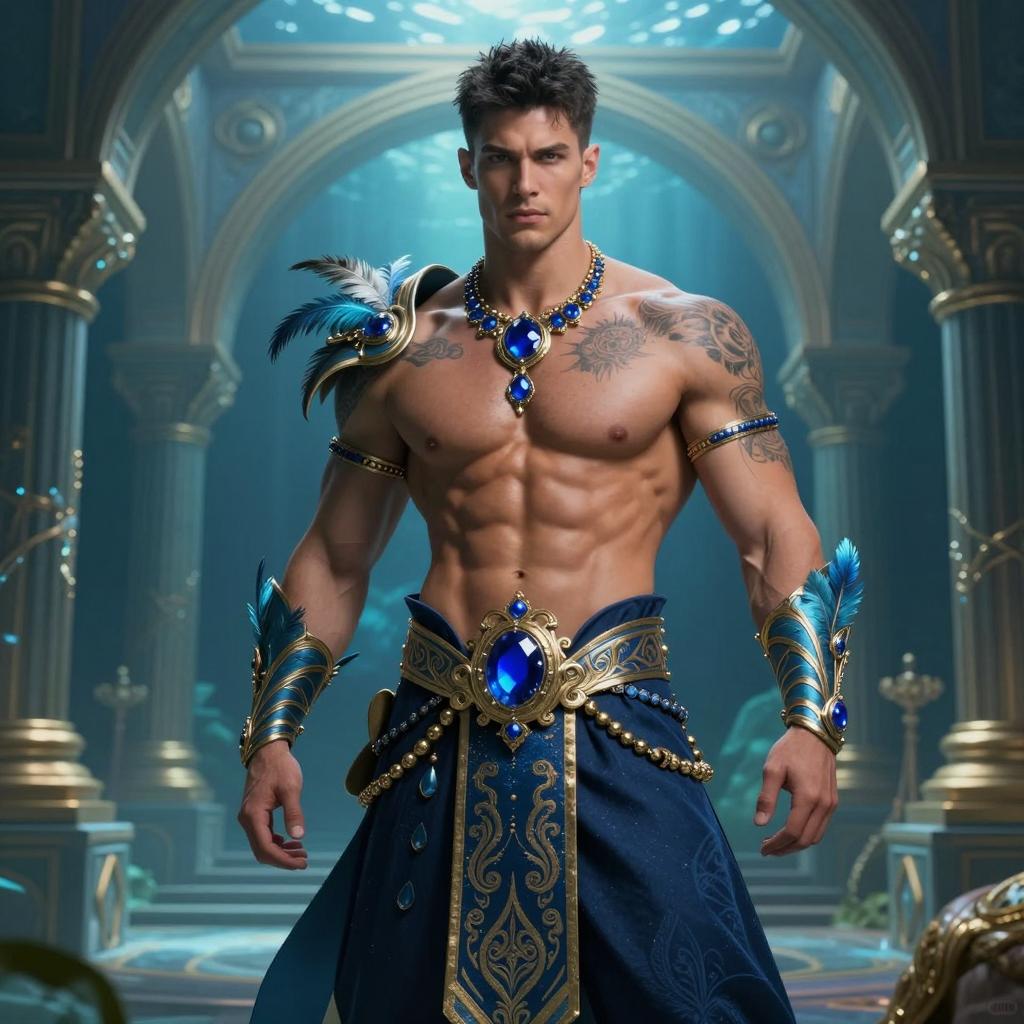 Atlantis theme party outfit, CGI, hyper-realistic, muscular male model with short dark hair, standing in a glowing, underwater-like temple, wearing ornate, blue and gold jewelry with feathers, abs visible, blue gemstone necklace, blue gemstone belt, dark blue pants with gold patterns, muscular build, tattoos on shoulders, blue and gold wristbands, arches and columns in background, soft glowing light, water reflections, fantasy, medieval-fantasy style, realistic ures, detailed lighting, dramatic pose.