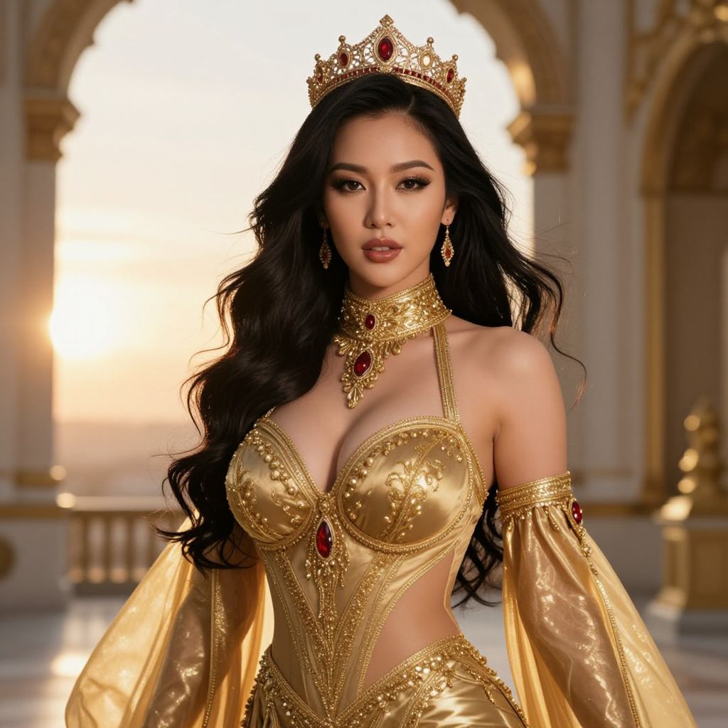 A stunning Asian woman with long, flowing black hair and a majestic crown resting on her head, her eyes sparkling with elegance and confidence. She has a seductive yet regal presence, with big tits and a sexy, alluring vibe. She is wearing a luxurious gold outfit adorned with intricate gold embroidery, a high-cut gold collar that accentuates her neck and shoulders, and flowing golden sleeves that shimmer in the light. The setting is a grand, opulent palace at sunset, with golden rays casting a warm glow over her figure. Her posture is poised and powerful, exuding both beauty and authority.