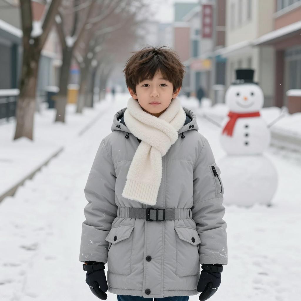 Photograph of a young boy with brown hair wearing a light gray winter coat with black buttons, a thick white scarf, gray belt, and black gloves. He stands on a snow-covered urban street with leafless trees and a snowman with a red scarf and black hat in the background. The scene is captured during daytime with soft natural light, creating a cozy winter atmosphere.
