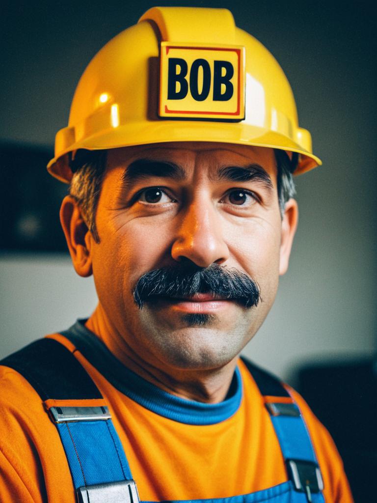 Man in Bob Builder Costume, cosplay festival photo, photorealistic realism