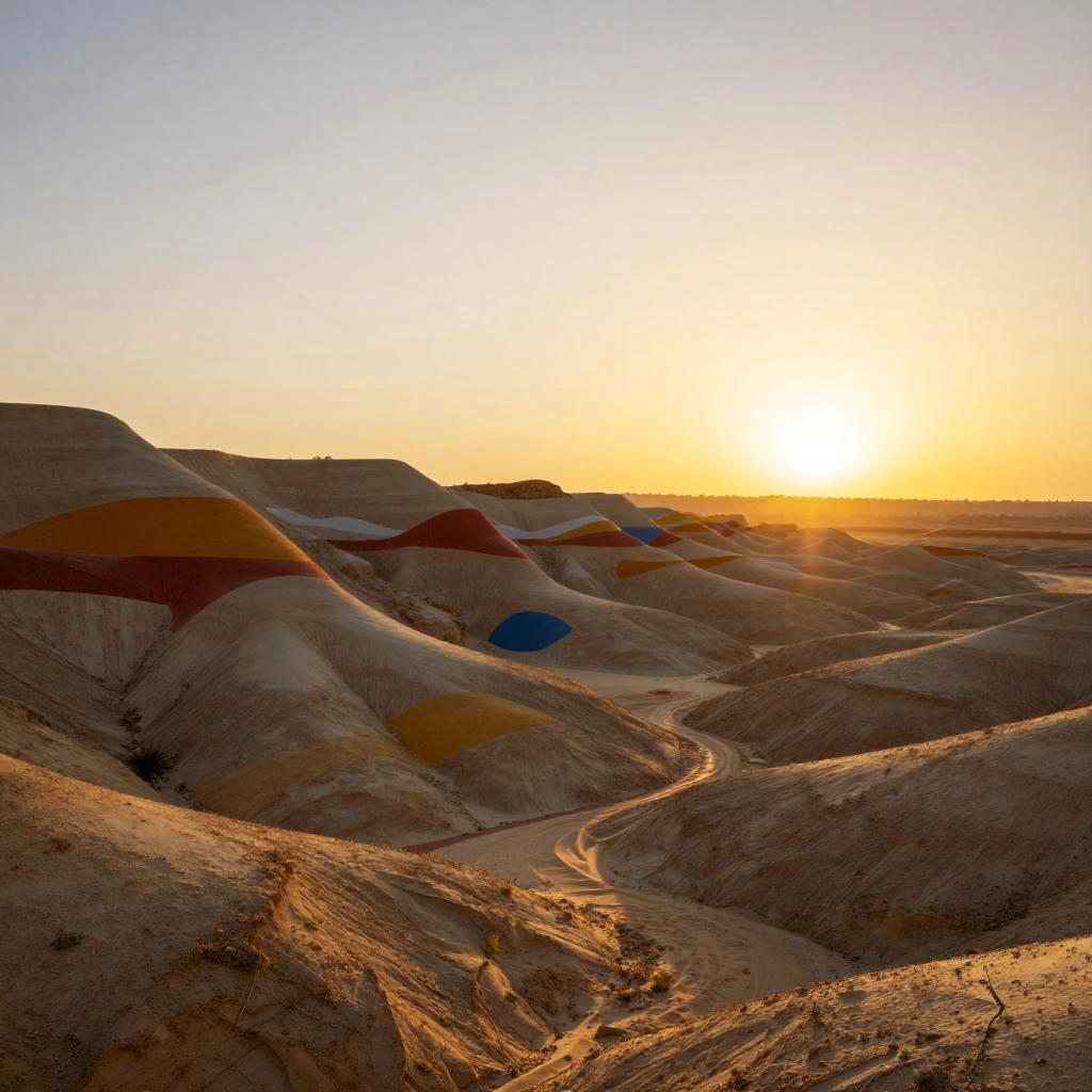 Sandy Expanse, dappled sandstone formations, crisp azure skies, high noon, Impressionist – soft brushstrokes and light play