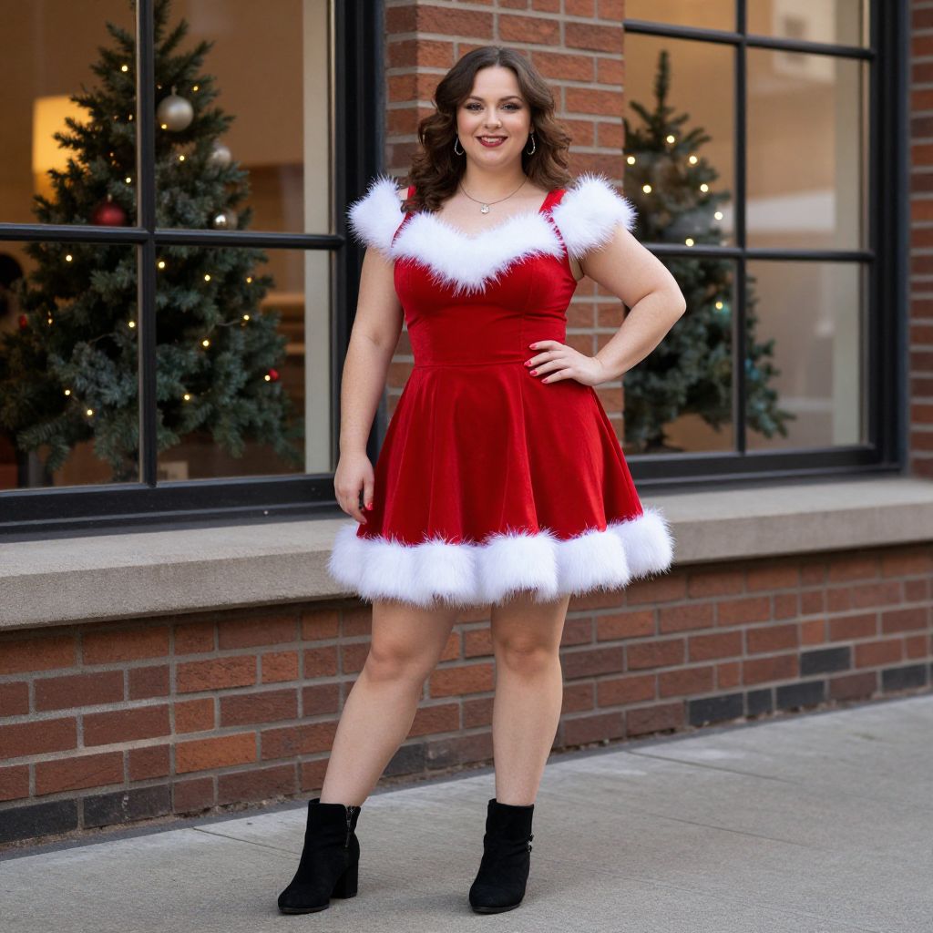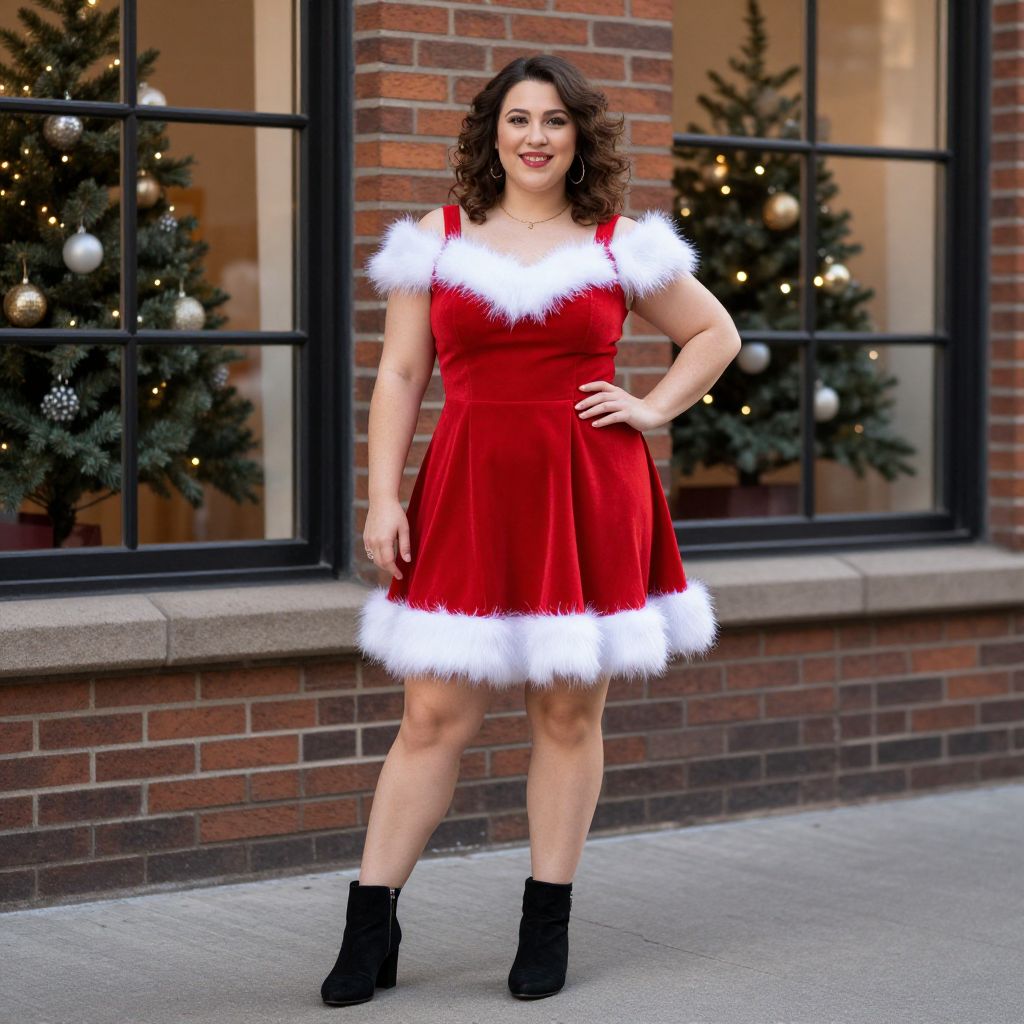 Radiant holiday cheer exudes as a curvy woman stands confidently outdoors, donning a festive red dress with plush white fur trim, complemented by black ankle boots and a warm smile, set against a brick building backdrop featuring large windows and a decorated Christmas tree inside.