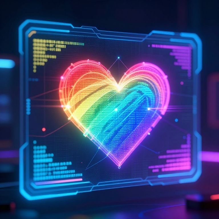 Heart finger pose stylized with neon light effects, glowing fingers forming heart shape, futuristic cityscape backdrop, dark mode with bright contrasting colors