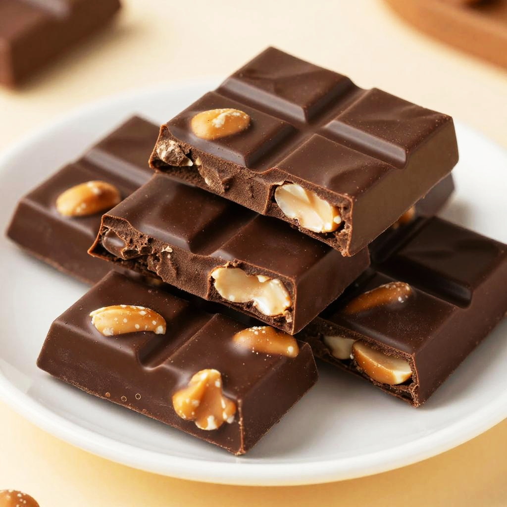 Photograph of a white plate filled with a stack of dark chocolate bars, each chunky piece generously studded with golden-brown peanut chunks. The glossy chocolate has a smooth, shiny texture, contrasting with the slightly rough, nutty inclusions. The background is softly blurred, keeping the focus on the rich, decadent treats. The image has a warm, inviting feel.
