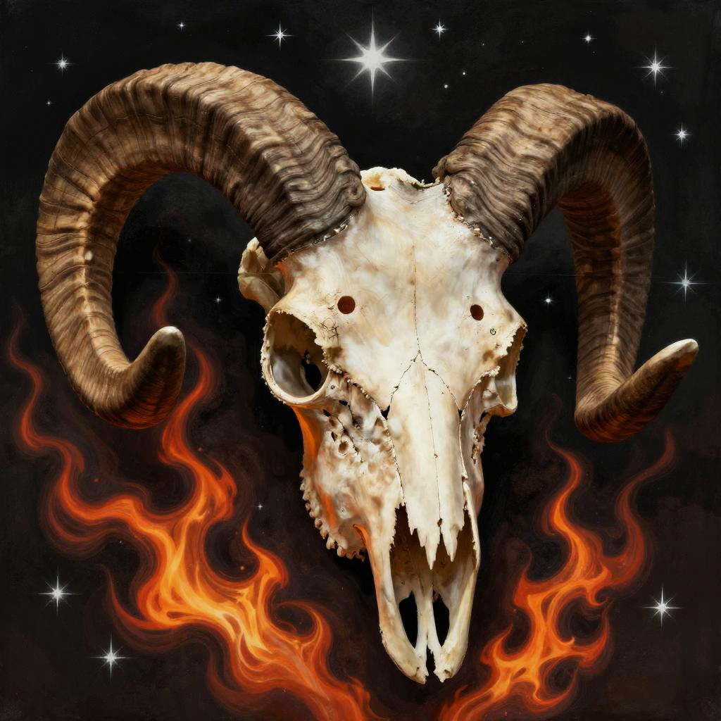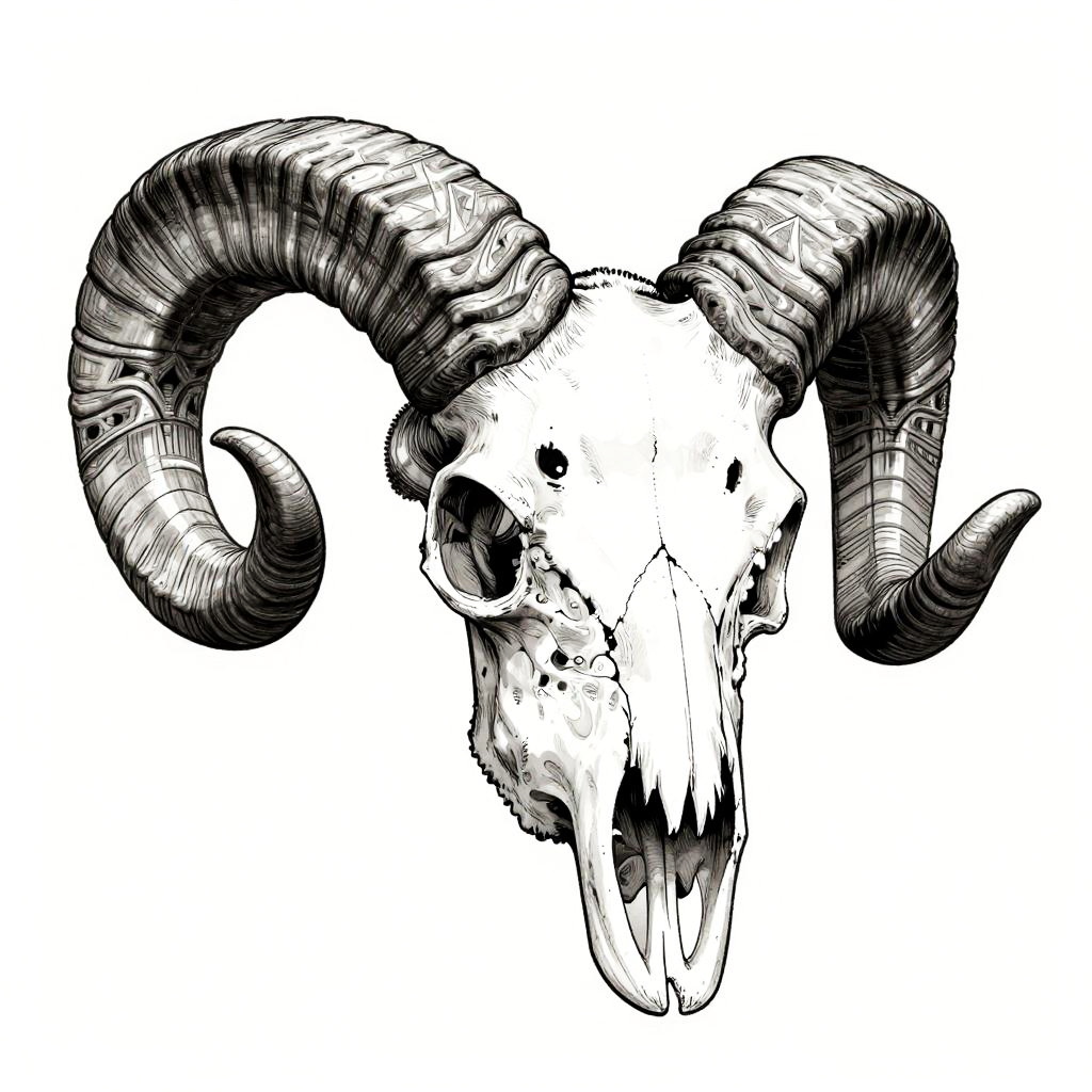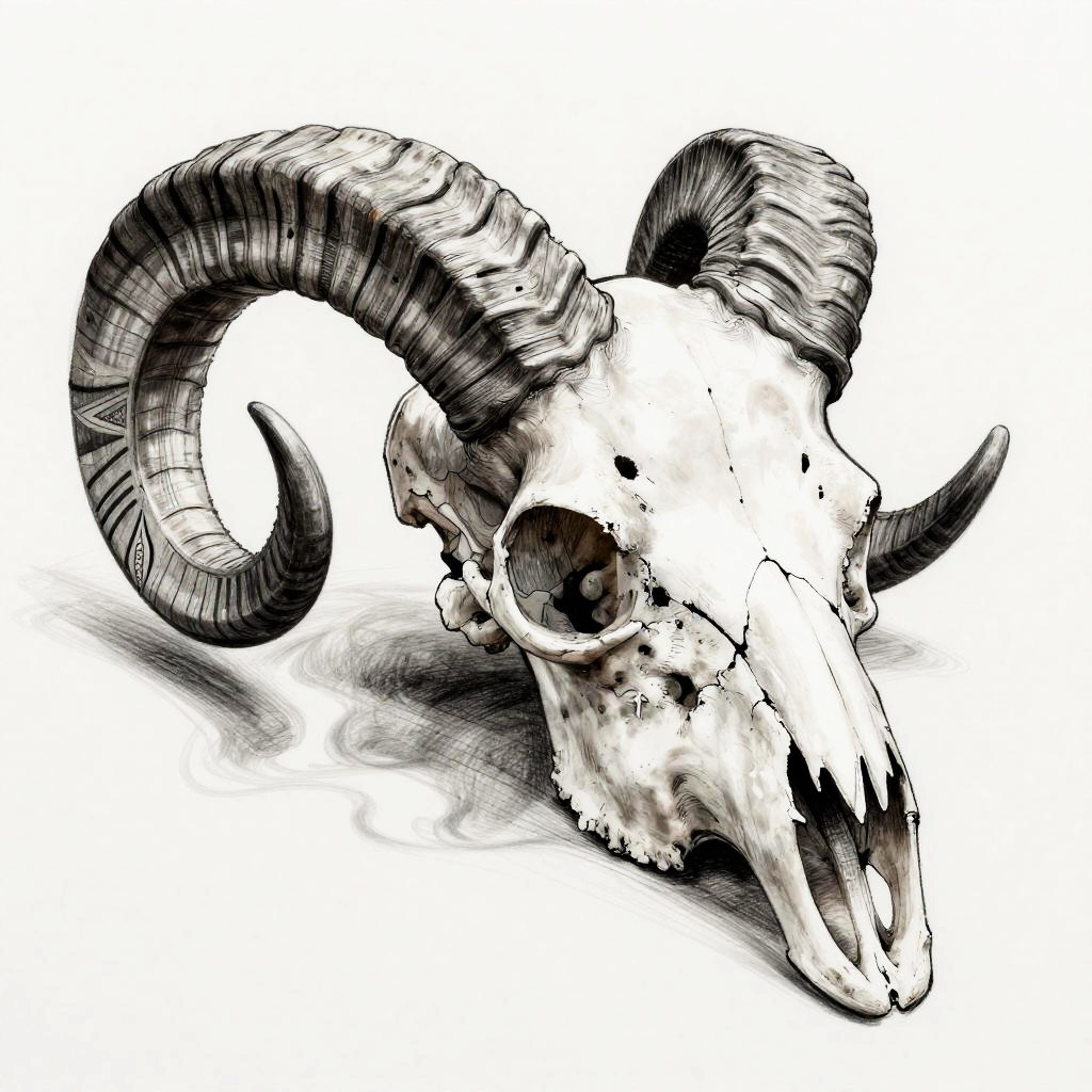 Aries ram skull drawing featuring a stylized illustration of a ram's skull with sharp, twisted horns, set against a smoky mystical background, dark gothic tones, highly detailed bone structure, blending realism with abstract elements for a dramatic effect