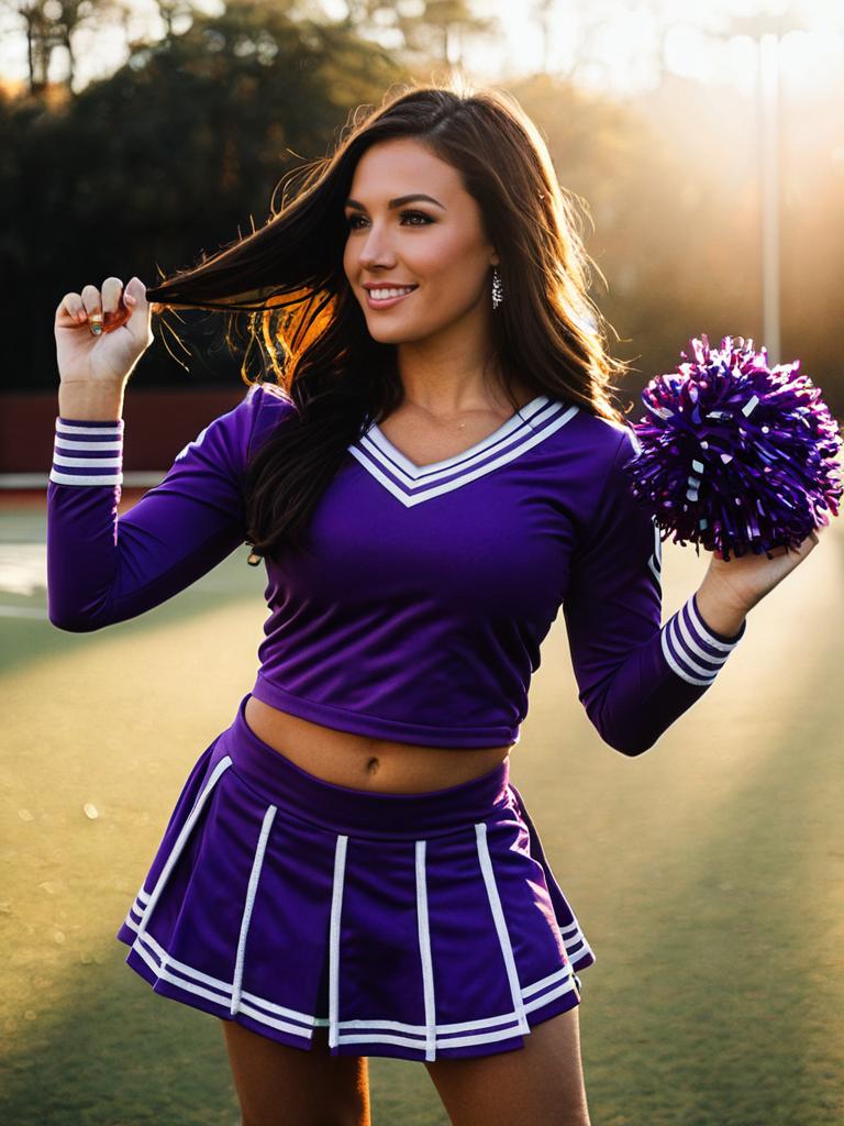 Purple Cheerleading Costume, a woman in a purple cheer uniform holding a purple pom pom --sref 1393
