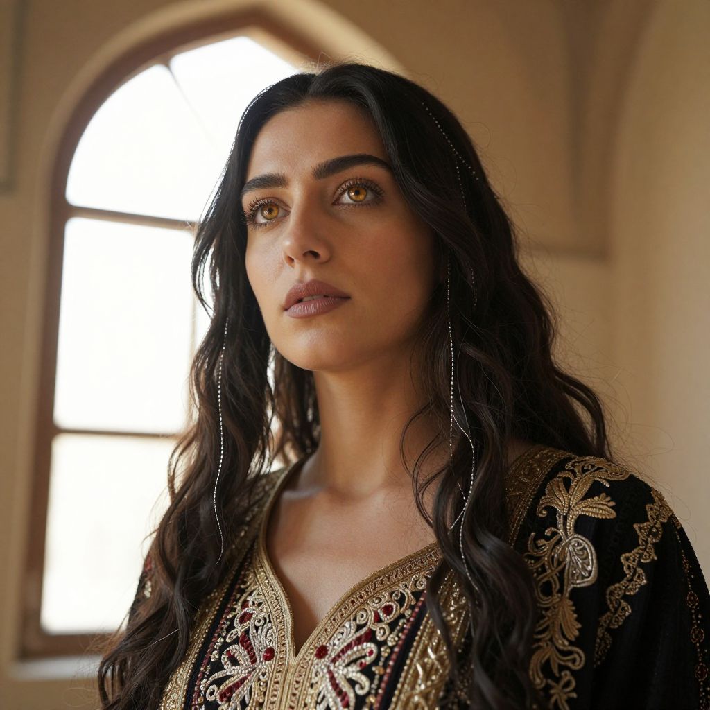 Craft a photorealistic portrait photograph showcasing an ethereal Middle Eastern woman with captivating golden-brown eyes and long, dark hair adorned with silver threads. Capture her from a low angle to emphasize gracefulness as warm sunlight streams through an ancient arched window. Her serene expression, juxtaposed against intricately hand-embroidered attire, exudes tranquility and introspection. This ultrarealistic portrait blends classical realism with subtle surrealism, detailing fragile facial features and the interplay of light and shadow on richly textured clothing—an enchanting fusion evoking timeless beauty and mystique.