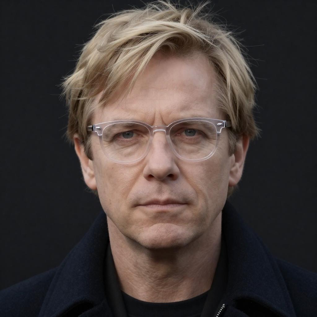 Portrait of a middle-aged Caucasian man with blonde hair and glasses, wearing a light blue shirt and a dark sweater. He is looking to the side with a serious expression. The background features a bookshelf filled with various books and framed black-and-white photographs on the wall. Natural light illuminates the man's face from the right side.
