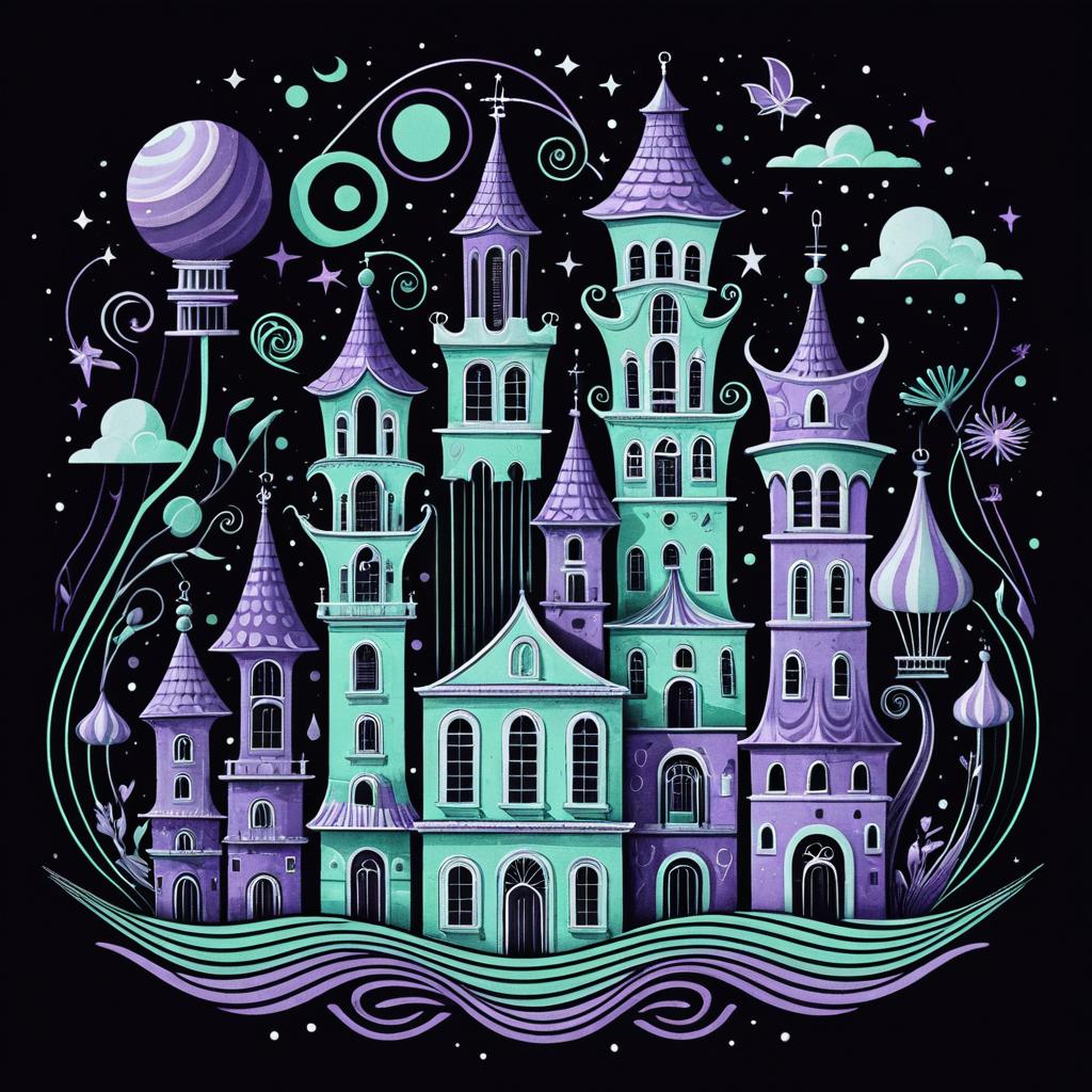 Futuristic architecture in a magenta and lime, incorporating elements of glitch art and cyberdelic. Set against a black background with wavy lines and organic shapes, the composition has a neon punk vibe. Key elements include floating buildings and digital patterns, creating a visually captivating and symbolic logo or illustration.