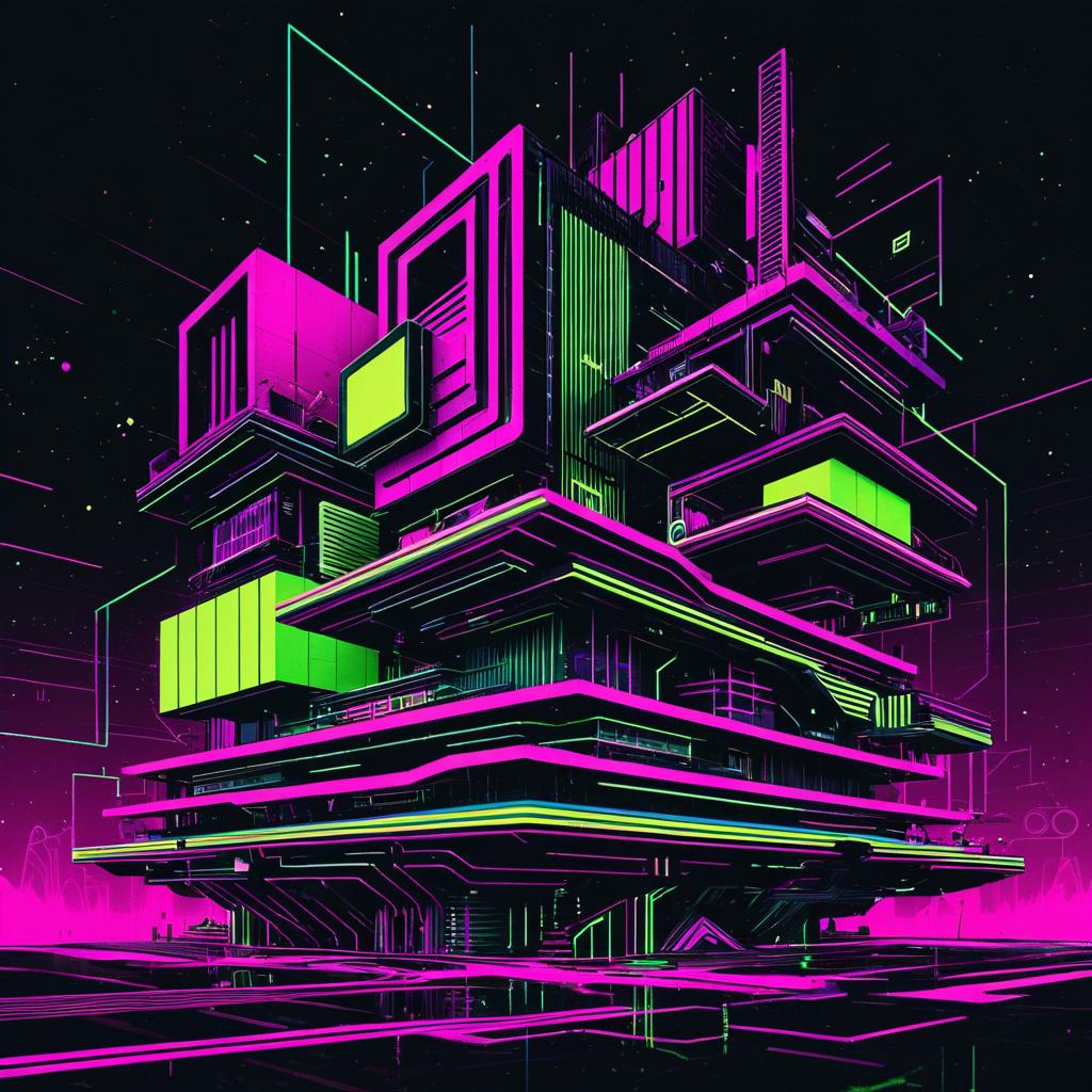 Digital illustration of a futuristic architectural structure featuring bold magenta and lime green colors with glitch art and cyberdelic elements. The building appears to float against a black background filled with wavy lines and organic shapes, evoking a neon punk aesthetic with digital patterns and geometric forms.