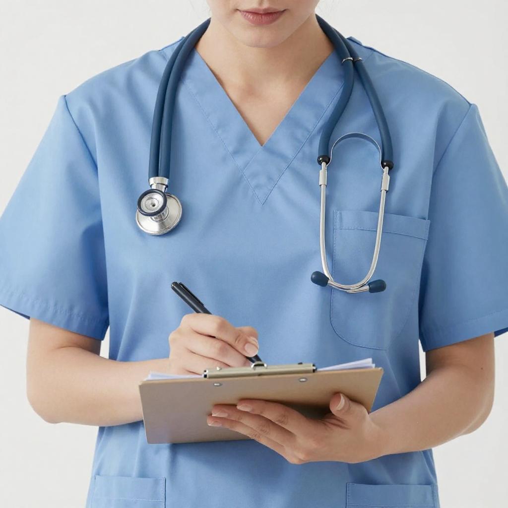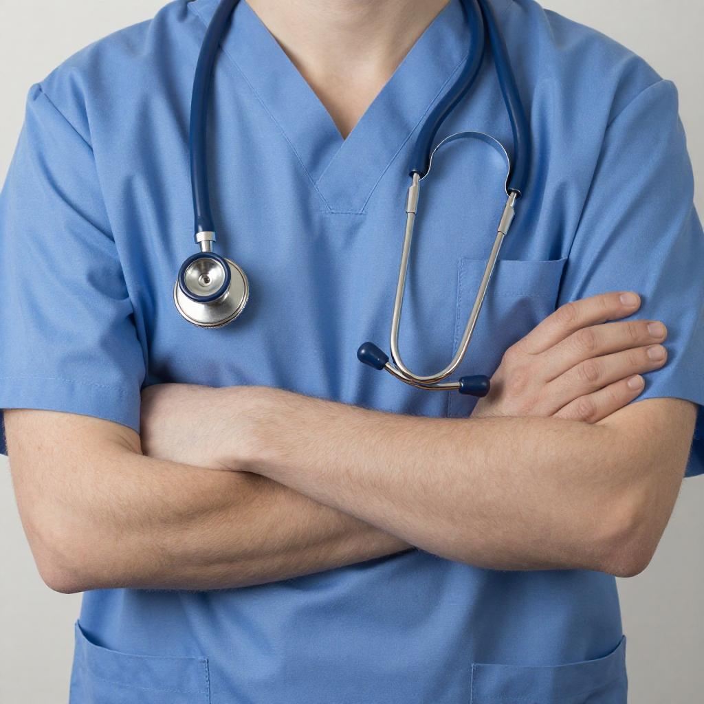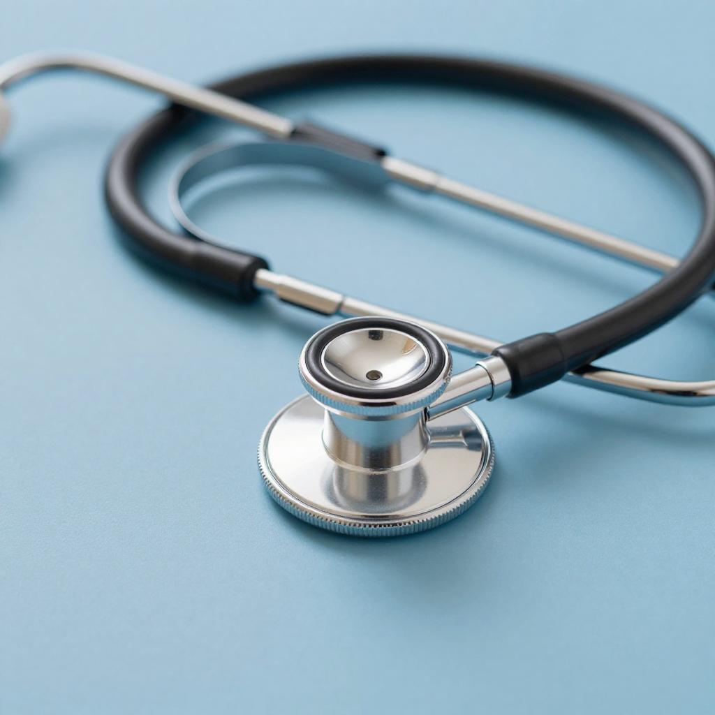 Photograph of a black stethoscope with a silver chest piece, lying on a white background. A bright red, plush heart is positioned in the center, where the stethoscope's earpieces cross. The lighting is even and soft, with no shadows. The camera angle is top-down, capturing the objects in a flat, symmetrical layout. The background is completely blurred, drawing attention to the stethoscope and heart. The depth of field is shallow, keeping the stethoscope and heart in sharp focus.