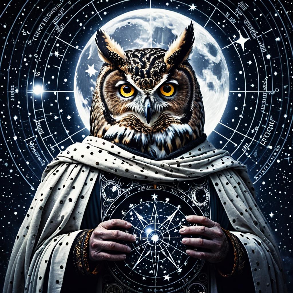 Character concept of a owl-headed astrologer, dressed in flowing celestial robes with star charts and a moonlit observatory background.
