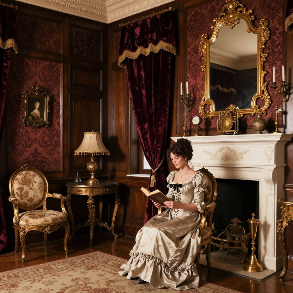 Viktorianisches interior of a grand parlor, richly decorated with dark wood paneling, velvet curtains, intricate wallpaper, antique furniture, fireplace with brass details, soft warm lighting, a woman in a corseted dress reading a book, vintage elegance