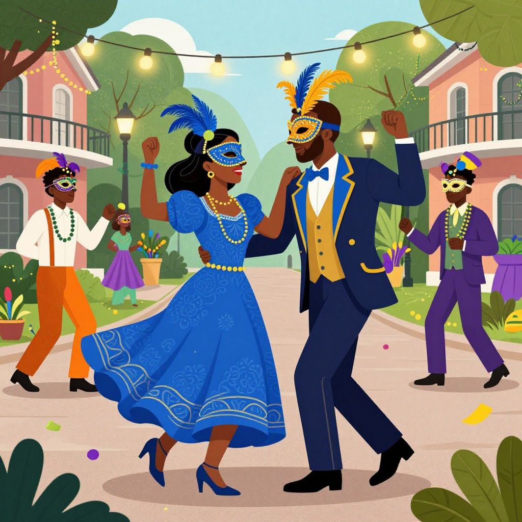 In this vibrant and lively illustration, a festive couple is captured in the midst of a Mardi Gras celebration in New Orleans. The woman, adorned in a flowing blue dress with intricate patterns and a matching feathered headpiece, dances gracefully alongside her partner, who is dressed in a sharp, elegant suit with gold accents. Both are wearing elaborate masks, with the man's mask featuring bold blue and orange patterns. They are accompanied by two other individuals, each donning masks and colorful attire, adding to the festive atmosphere. The scene is set in a lush, town-like environment with charming houses, lush greenery, and string lights that cast a warm glow over the scene. The overall composition is dynamic, with the couple and their companions moving in harmony, creating a sense of movement and celebration. The interplay of colors, textures, and shapes enhances the lively and joyful mood of the illustration, capturing the essence of a Mardi Gras celebration in New Orleans.