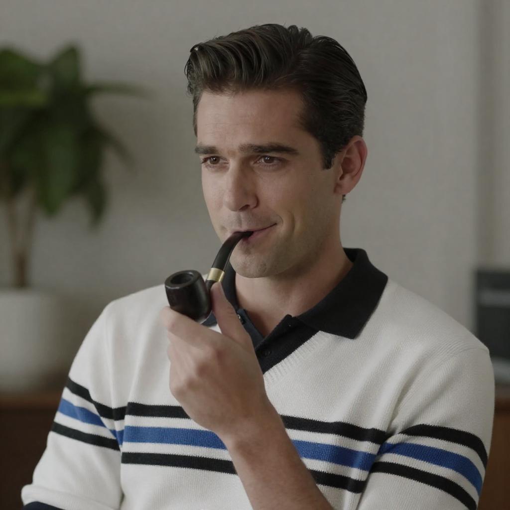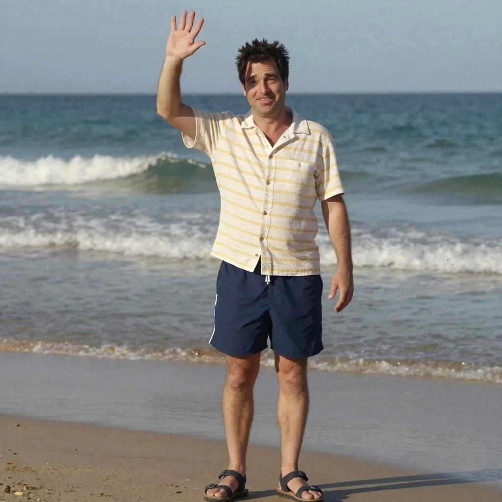 Waving his hand at me, smiling happy middle aged 40 year old Michael Cera with very short dark brown hair, wearing a terrycloth white shirt with yellow horizontal stripes on it, wearing pastel navy blue swimtrunk shorts and sandals, standing alone on the beach, waving at me, nerdy, dork, Ektachrome, Romantic, Realism, flat lighting, gilded technique, DOF, bokeh, digital cinematic color grading natural lighting cool shadows warm highlights soft focus actor directed cinematography dolbyvision