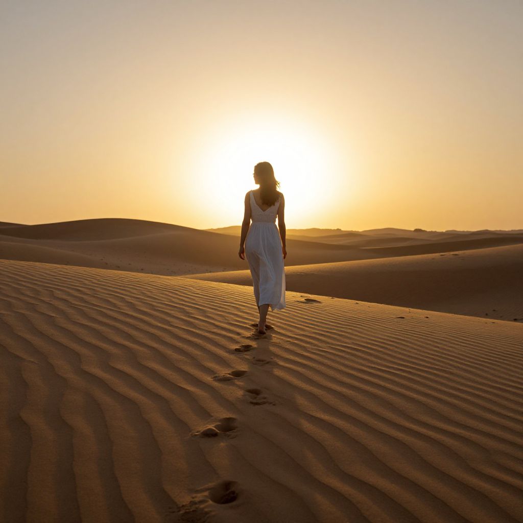 Silhouetted against the golden sunset, a woman in a flowing white dress walks barefoot across rippling sand dunes, leaving a trail of footprints that stretch toward the horizon.