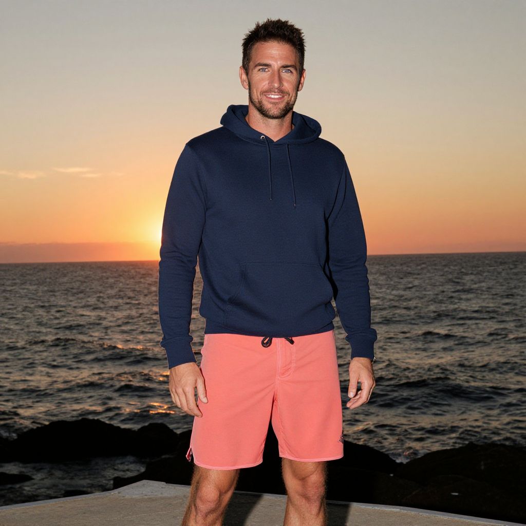 A man, lightweight navy hoodie, vibrant coral board shorts, quick-dry fabric, relaxed fit, open-air platform, gentle ocean breeze, vibrant sunset casting warm hues, technicolor film stock, relaxed smile, enjoying the moment. Man has masculine face and piercing eyes