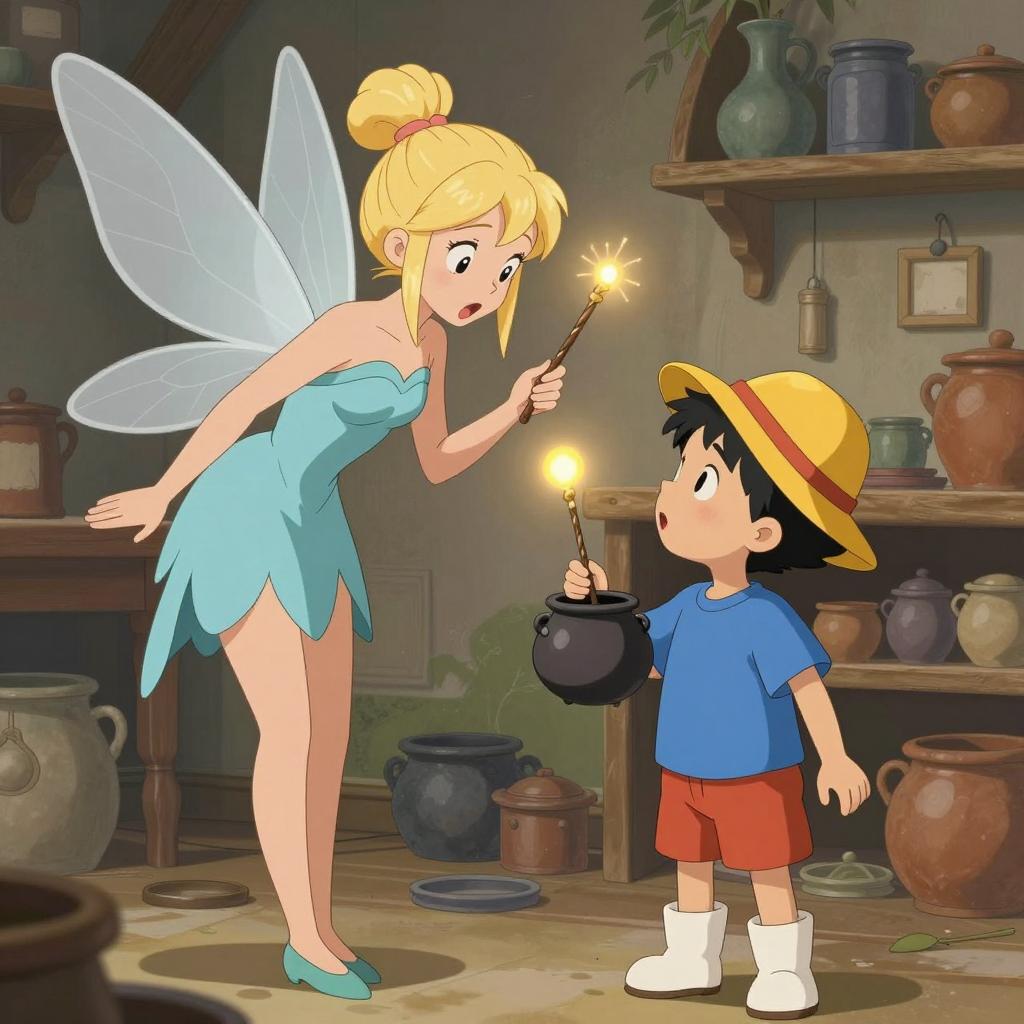 Illustration of a blonde fairy woman with blue dress and wings, holding a magic wand, facing a young boy with black hair, yellow hat, blue shirt, red shorts, and white boots. He holds a pot with a glowing wand tip. Background includes cluttered shelves with pots and jars. Fairy's expression is surprised, boy's expression is curious. Two people, fairy on left, boy on right.