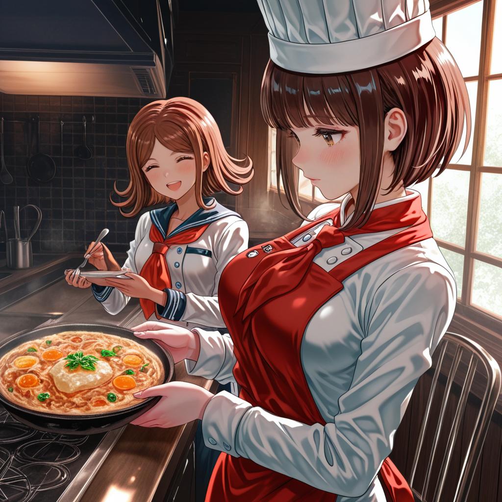 Digital anime-style artwork featuring two female characters in a kitchen. One character dressed as a chef with a white hat, red apron, and red neckerchief is holding a pan with a creamy pasta dish garnished with herbs. The second character, wearing a school uniform with a red scarf, is happily tasting the food. The scene is well-lit by natural light coming through a window, with detailed kitchen utensils and stove in the background.