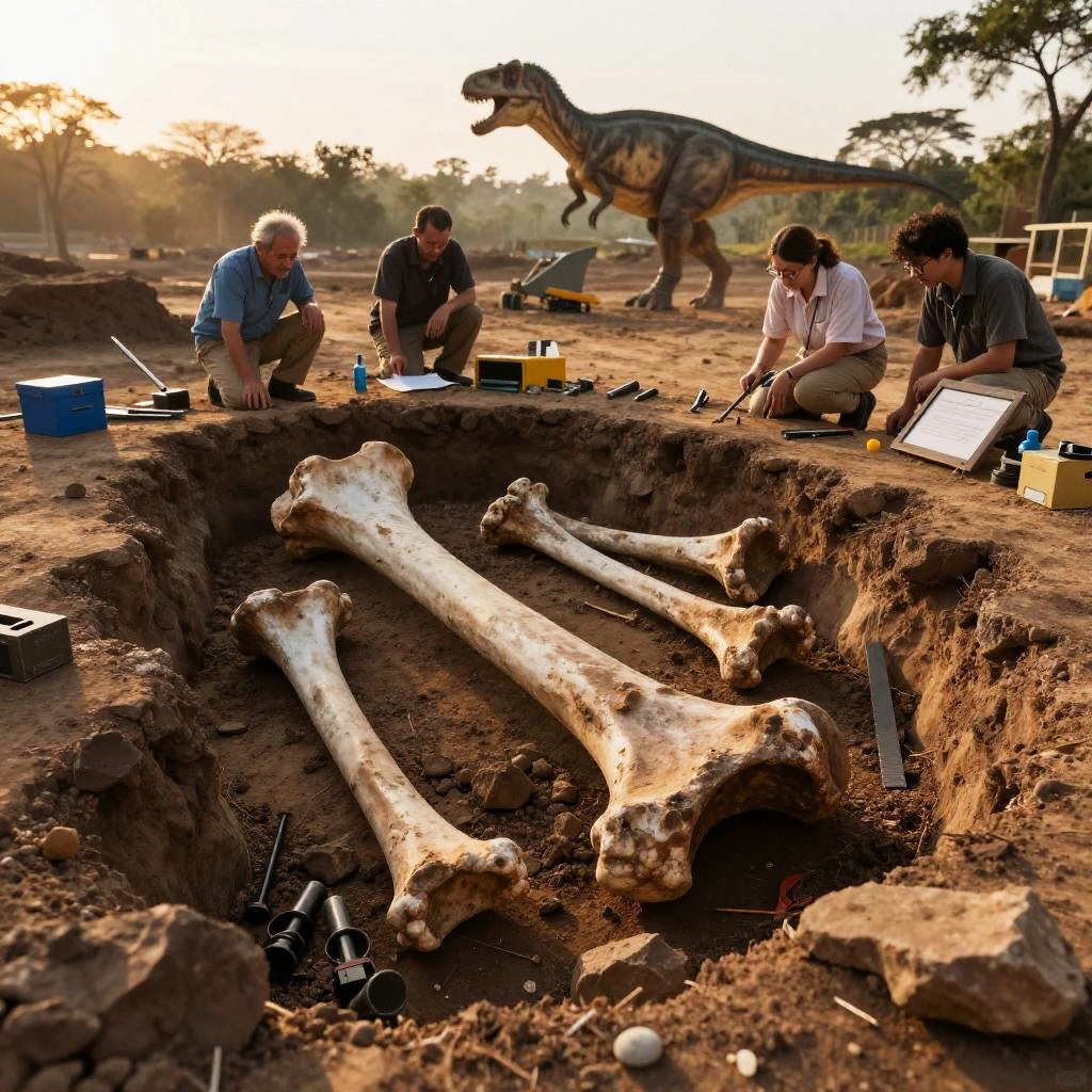 Dinosaurio fossil excavation site at dawn, scientists uncovering large bones from sedimentary rock, detailed tools and equipment around, warm natural light highlighting textures of bones and soil, educational and scientific atmosphere in hyper-realistic illustration