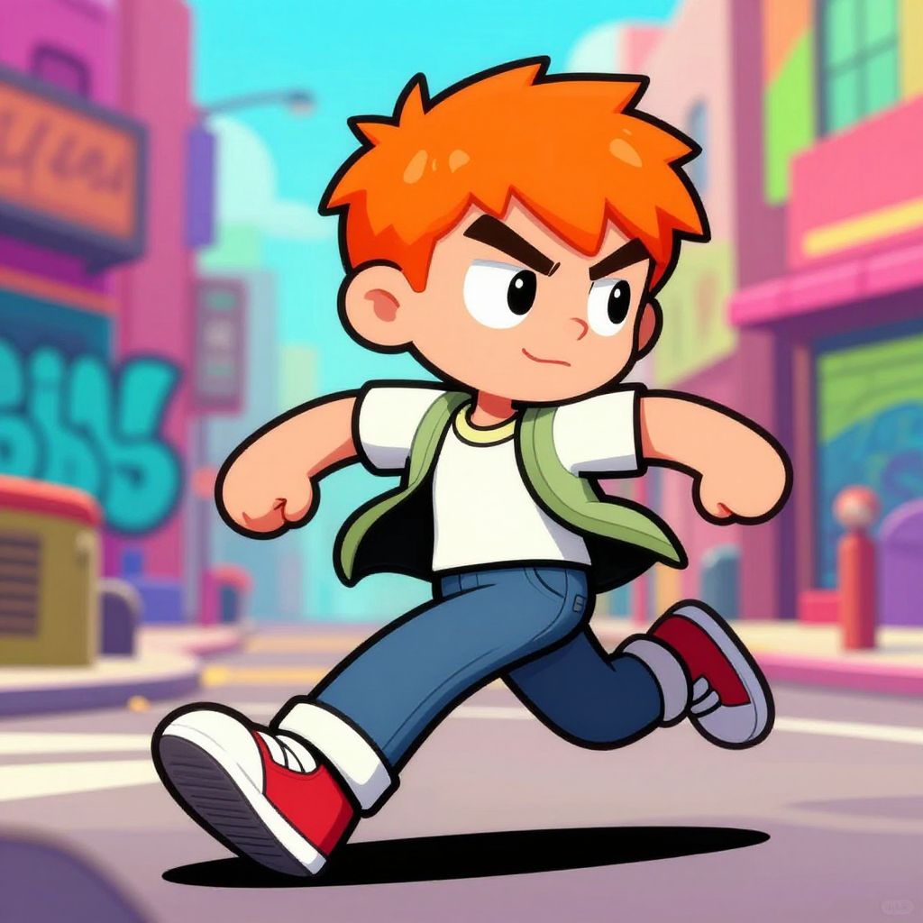 Orange hair boy cartoon, dynamic pose running through a colorful city street, wearing casual clothes and sneakers, vibrant urban graffiti background, energetic and lively color palette, exaggerated facial features, comic book style