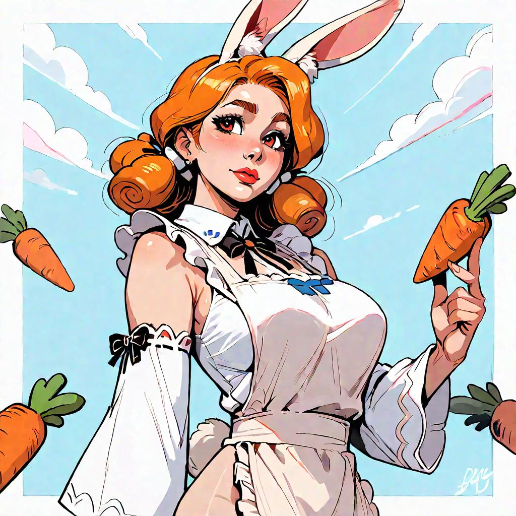 Score_9, score_8_up, score_7_up, uncensored, source_anime, 1girl, mature female, thick eyebrows, bunny-shaped pupils, rabbit ears, animal ear fluff, apron, dress, detached sleeves, bow, carrot hair ornament, :d, bent over, blush, hand on own thigh, hand up, holding, holding bag, holding with tail, looking at viewer, salute, smile, solo, standing, new year, shiba inu, watermark