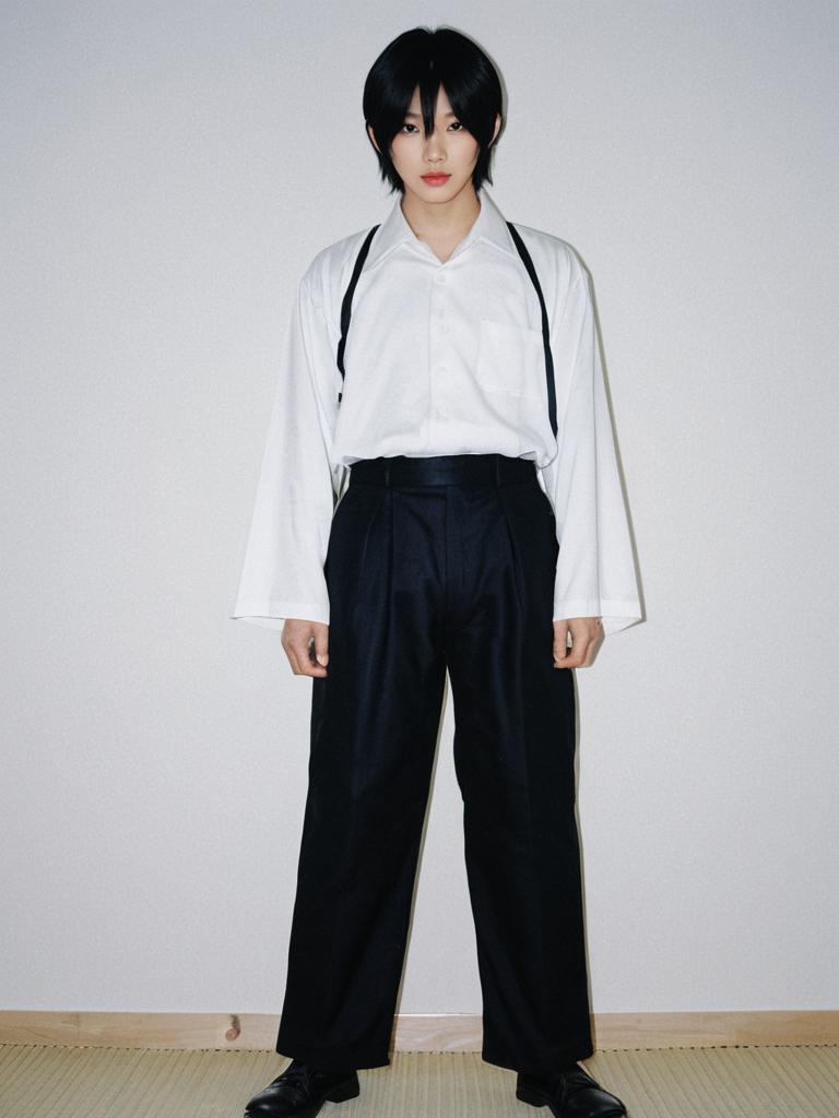 Photograph of an Asian person standing against a plain white background. They have short, black, slightly messy hair and are wearing a white, long-sleeved dress shirt with black suspenders and black, high-waisted trousers. Their lips are painted red, adding a pop of color to the otherwise monochrome outfit. They stand with a neutral expression, feet slightly apart, and hands relaxed by their sides. The floor has a light wooden texture with a visible seam at the bottom edge. The overall style is minimalist and slightly formal.