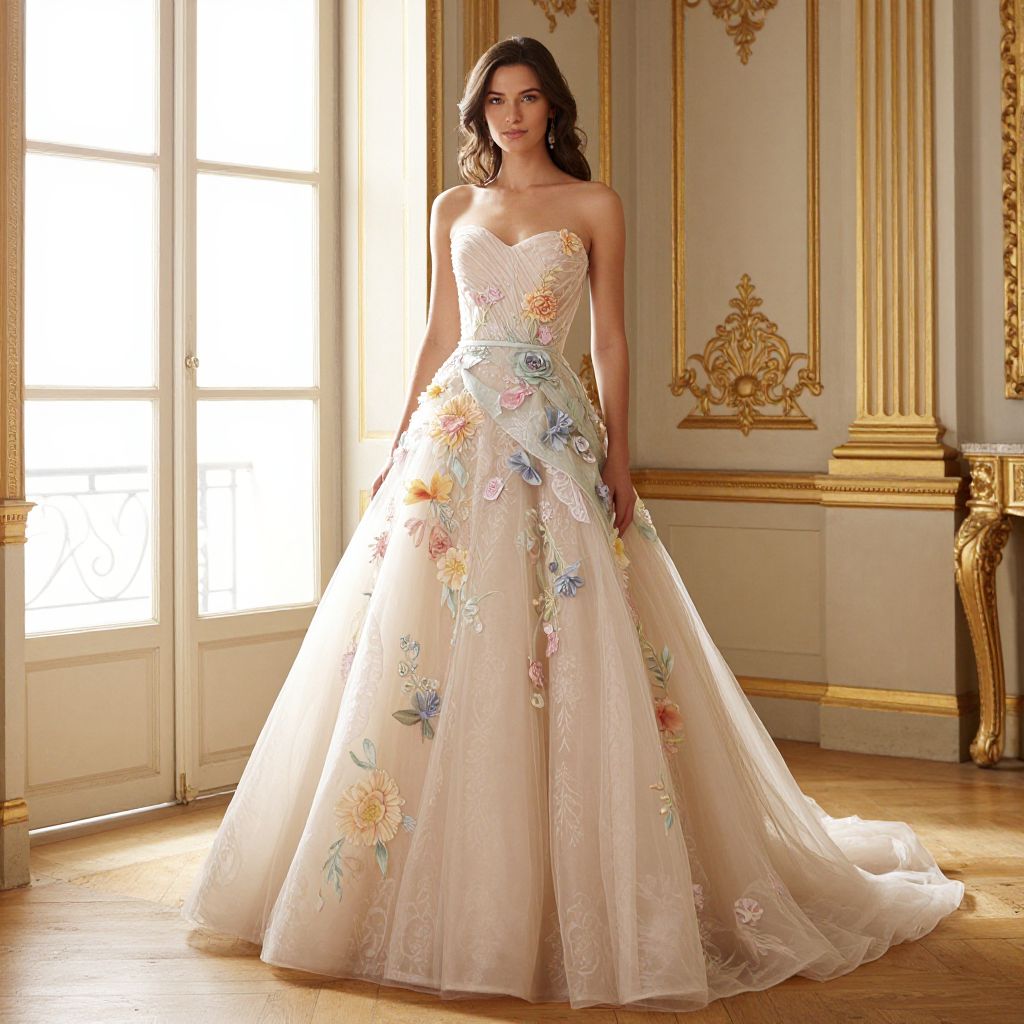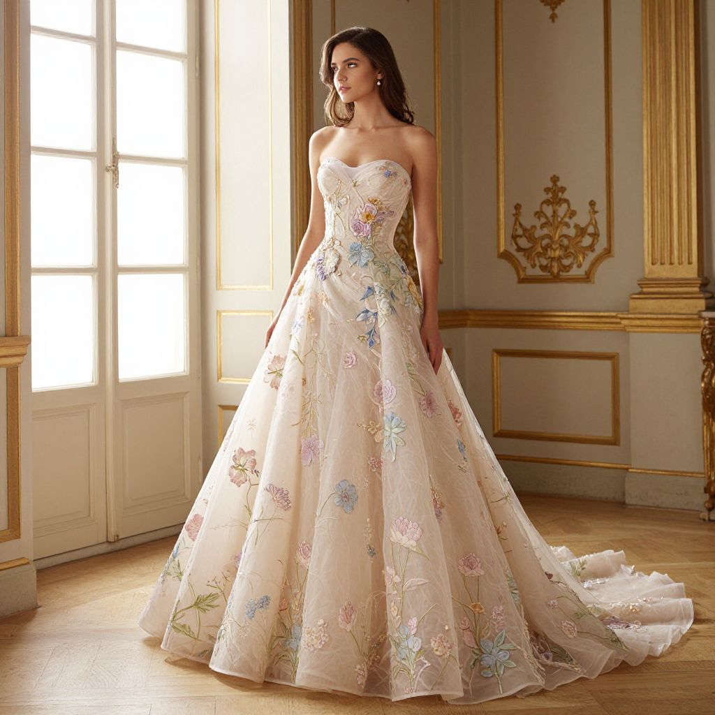 Photograph of a slender woman with long, wavy dark brown hair, standing in an elegant, sunlit room with gold-trimmed white walls and wooden floors. She wears a strapless, white ball gown adorned with pastel-colored floral embroidery, featuring a fitted bodice and a full, flowing skirt with a trailing train. The dress has a sweetheart neckline and delicate, translucent fabric. She gazes to the right with a serene expression. Sunlight streams through tall, white-framed windows on the left, casting a soft glow on the scene. The room's ornate decor and the woman's graceful posture exude a timeless, classical elegance.