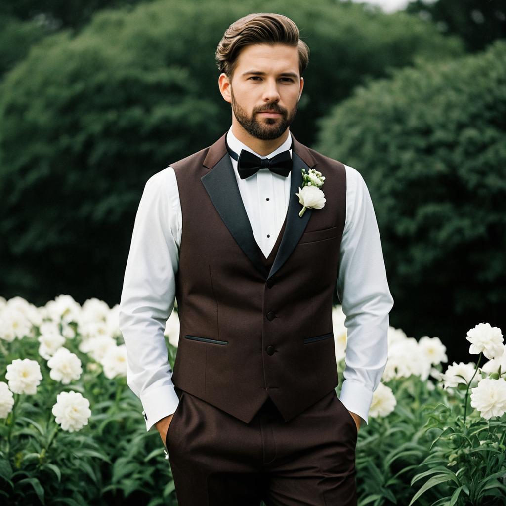 Casual wedding outfit groom,1boy, male focus, solo, realistic, necktie, white flower, brown hair, suit, looking at viewer, shirt, formal, facial hair, white rose, blue necktie, flower, white shirt, standing, pants, vest, white suit