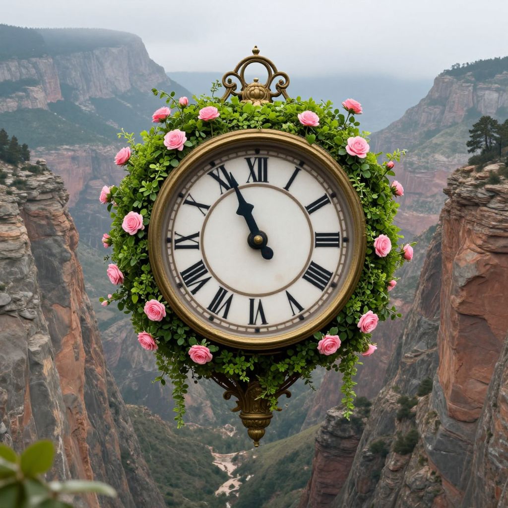 Colossal clock encased in vibrant green vines and adorned with blooming pink roses floats serenely above a rugged canyon, its Roman numerals and ornate hands casting a timeless presence against the backdrop of misty mountains and rocky cliffs.