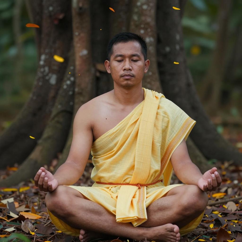 A young Buddhist monk wearing an orange robe standing on an ancient stone pedestal, surrounded by old weathered temple ruins with intricate carvings, natural sunlight illuminating the scene, vibrant orange color robe contrasting with grey stone textures, peaceful and contemplative atmosphere